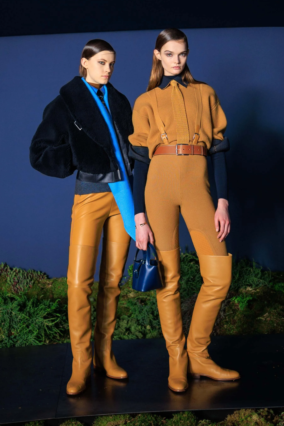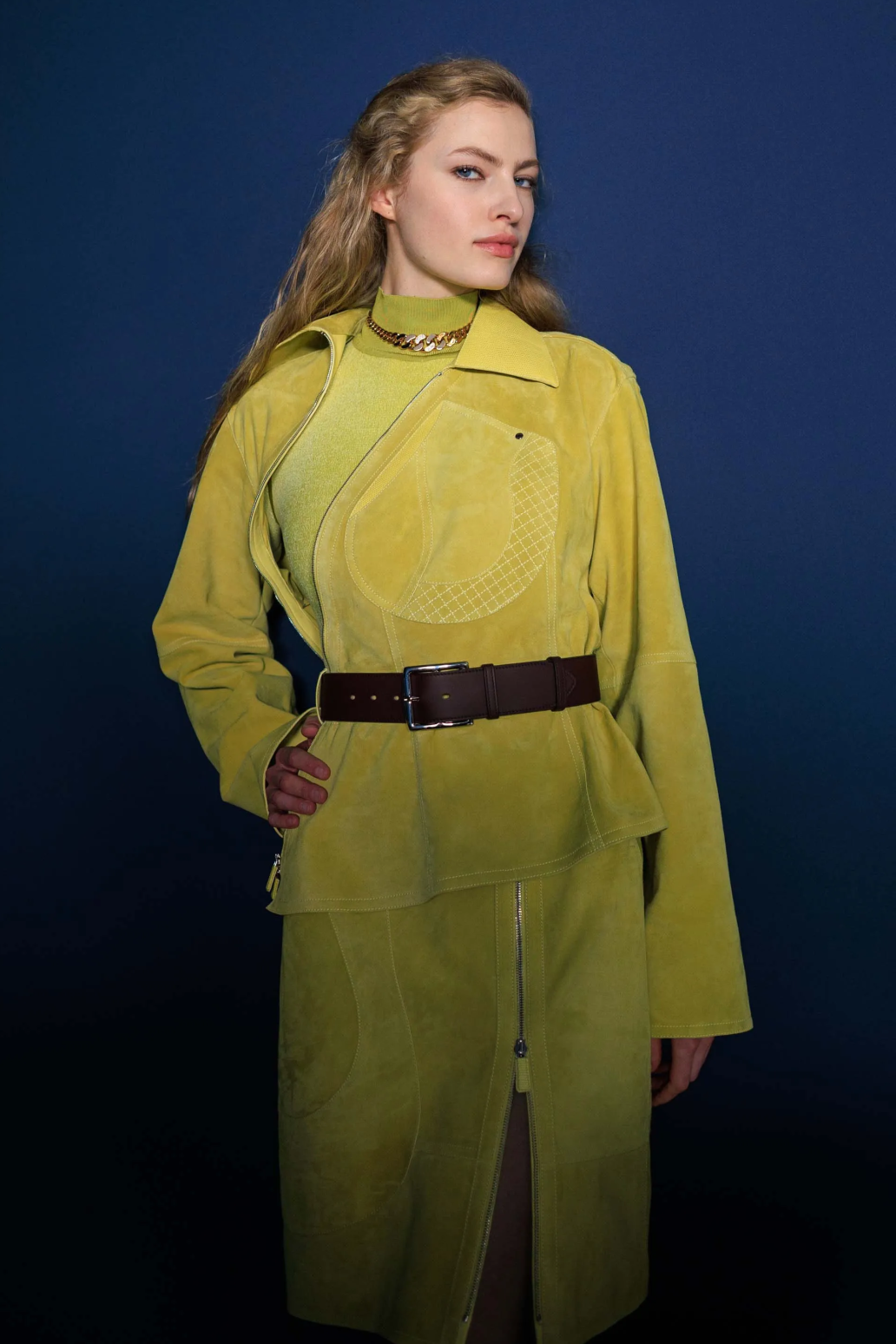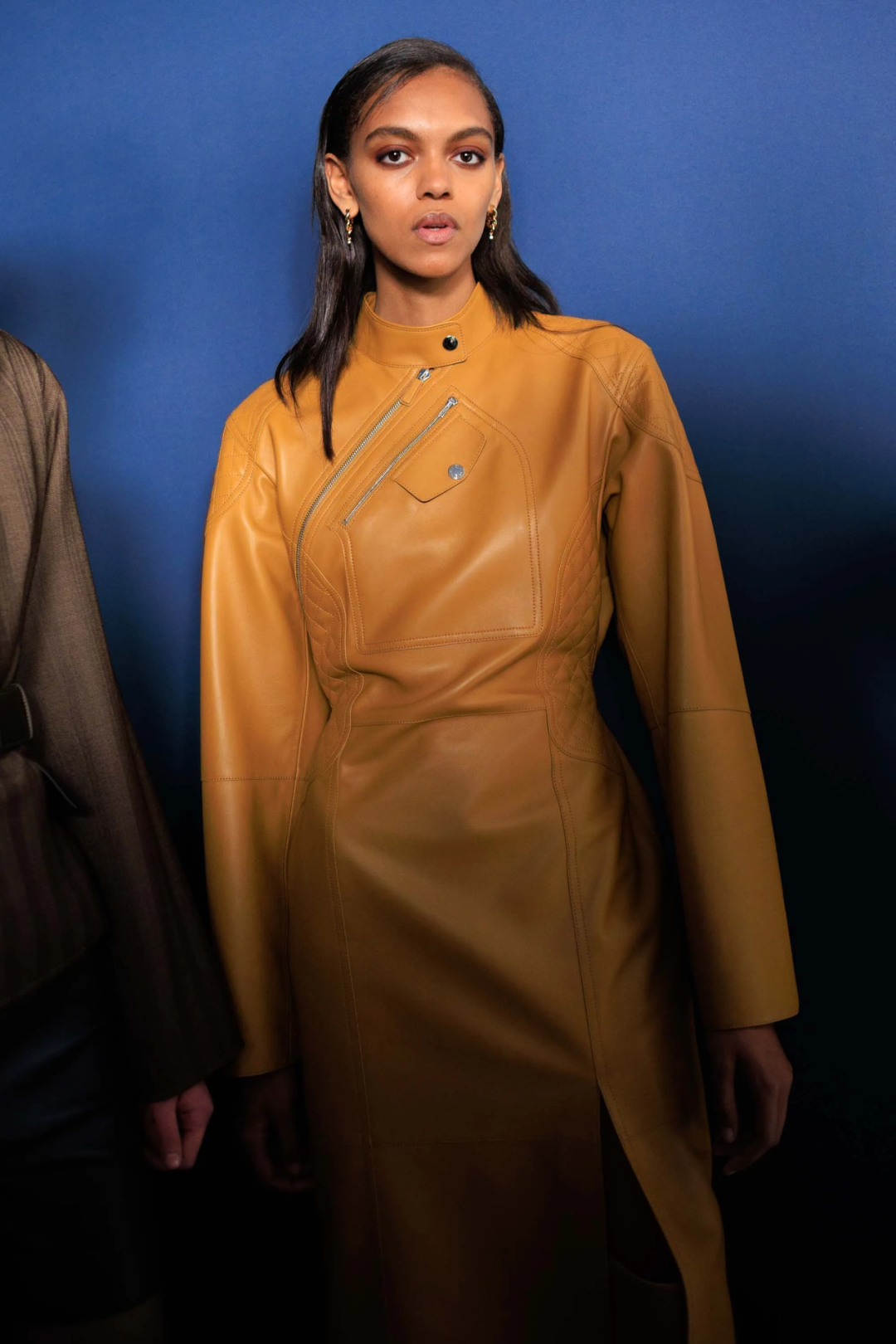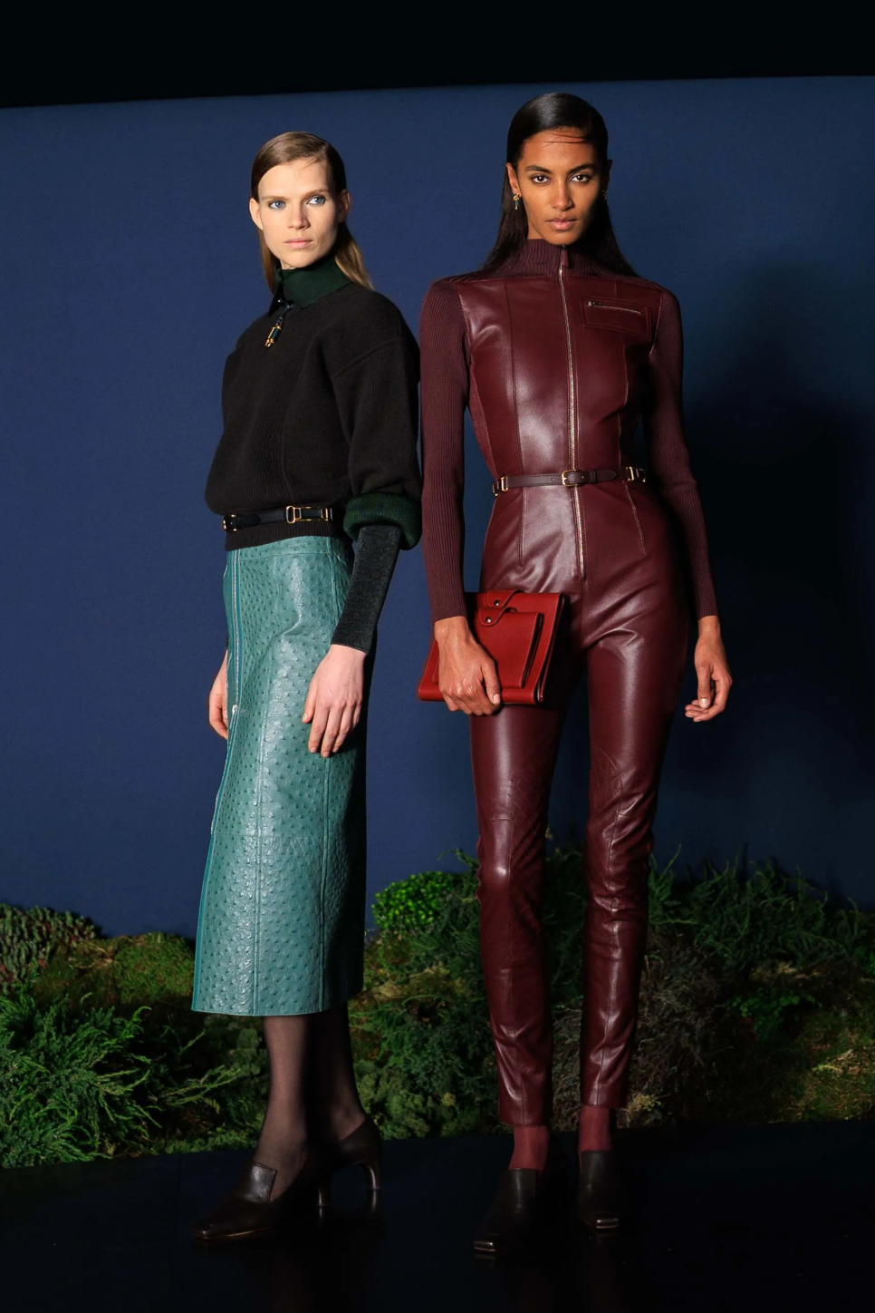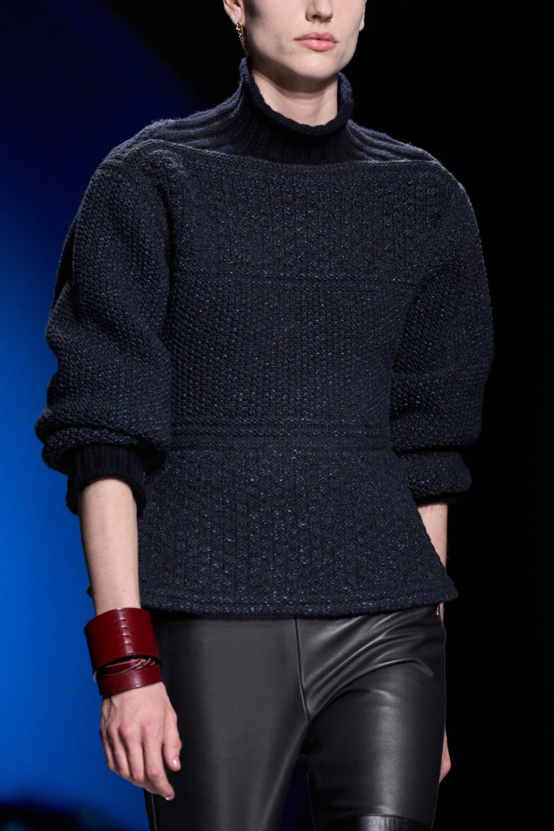 一眼可辨的高品质皮革和功能性“机关”不再赘述。真正精彩的新意在于她对面料“光感”的把握,比如在行动中变换红蓝光影的丝质混纺面料,挺括而充满雅致弧光。看似深邃厚重的针织和皮革面料上,有的被赋予了一层珠光“图层”,如同繁星点点的夜色浪漫地包裹着身体,还有从胸口延伸到腋窝和侧腰线处的拉链设计,凸显了女性的曲线之美。就像Nadège Vanhée所说的,这个系列“既可以让你隐藏自己,同时又性感十足。”两个看似矛盾的概念反而变得相辅相成。