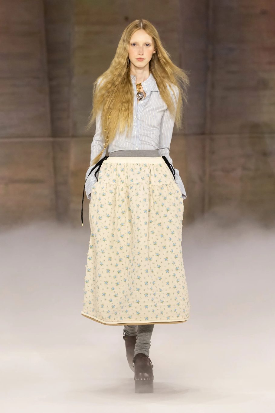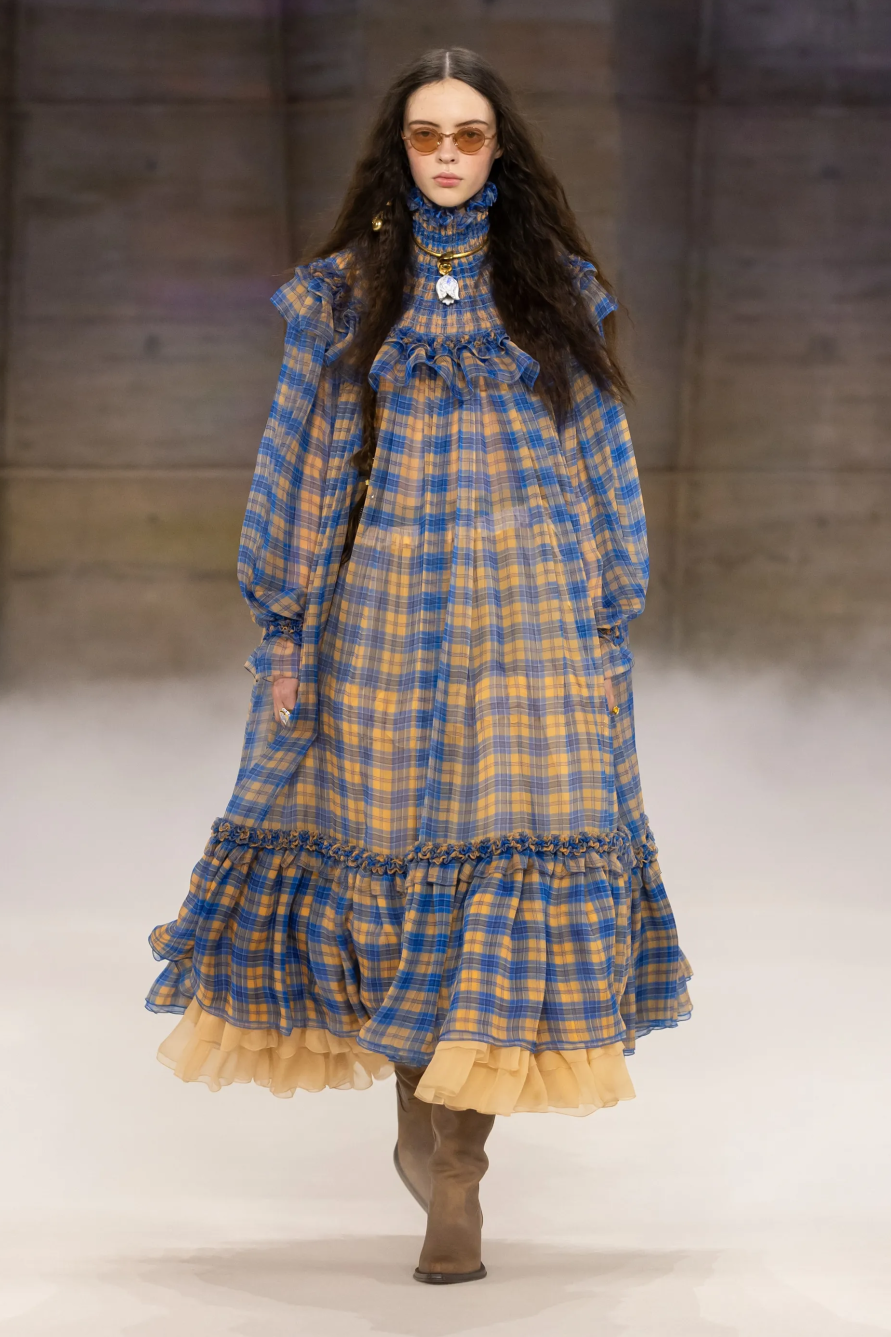 当你看到Chemena Kamali的本季新作时,或许还是脱口而出“波西米亚”四个字,但实际上,她的灵感板上粘贴着Brooke Shields年轻时穿着格子衬衫的照片、60年代美国大学生参加社会运动的照片,还有身着传统手工服饰的荷兰女性的照片,将这些要素扩充到Chloé轻盈、飘逸、蓬松的视觉呈现之中,形成完整的有机体。