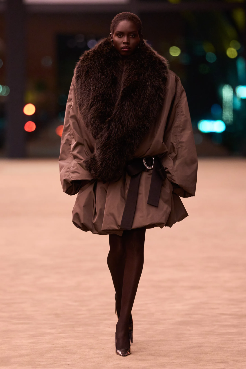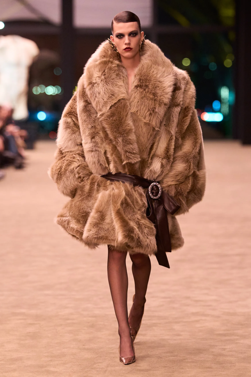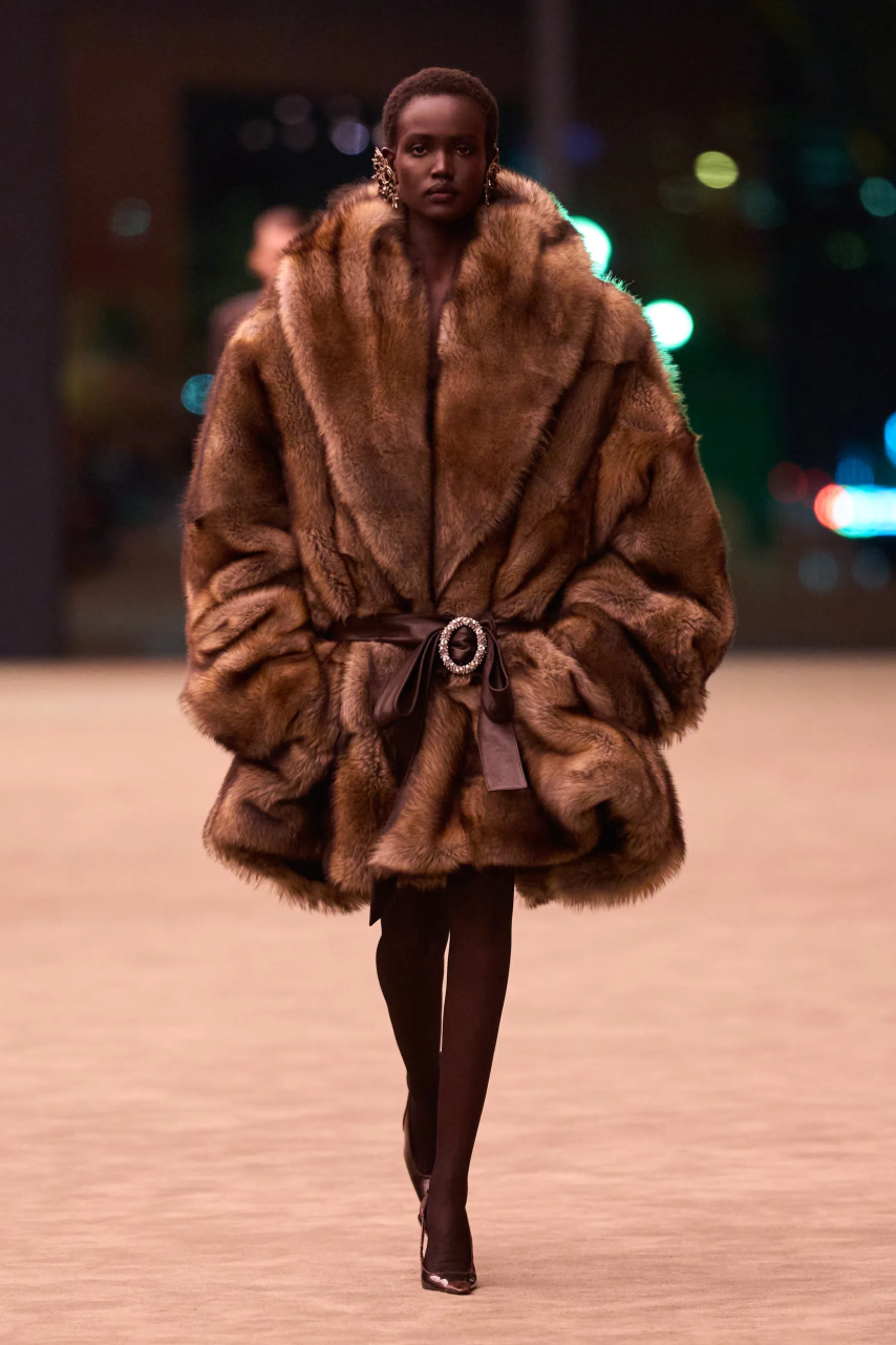 当然,Vaccarello也在持续地玩味性感,硅涂层轻薄蕾丝技艺的运用,让柔软的蕾丝呈现出富有包裹感的性感。与此同时,夸张的廓形皮草大衣也卷土重来,与蕾丝的露肤度形成互补。Saint Laurent的性感从来不装腔作势,而是女性骨子里的强势被释放,她可以选择隐匿在时装之下,也可以随时坦露自我,无论哪种姿态,始终都锋芒毕露。
