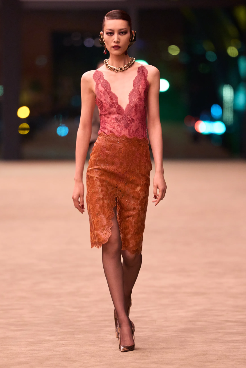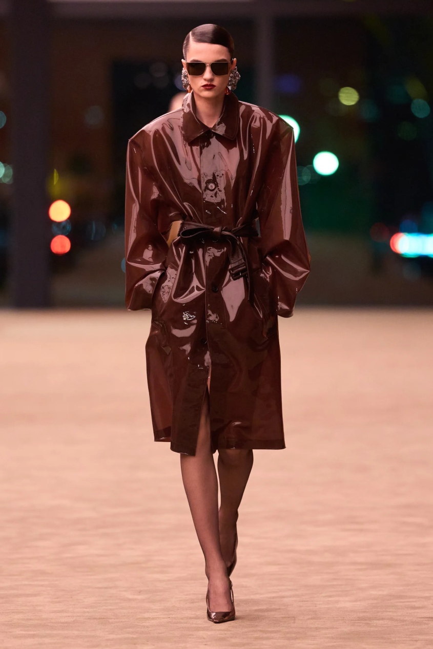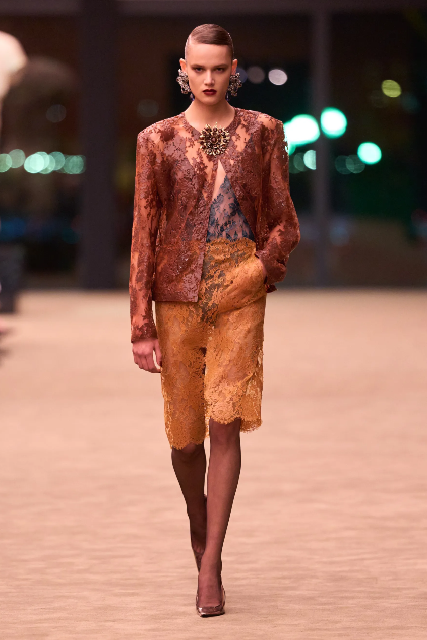 当然,Vaccarello也在持续地玩味性感,硅涂层轻薄蕾丝技艺的运用,让柔软的蕾丝呈现出富有包裹感的性感。与此同时,夸张的廓形皮草大衣也卷土重来,与蕾丝的露肤度形成互补。Saint Laurent的性感从来不装腔作势,而是女性骨子里的强势被释放,她可以选择隐匿在时装之下,也可以随时坦露自我,无论哪种姿态,始终都锋芒毕露。