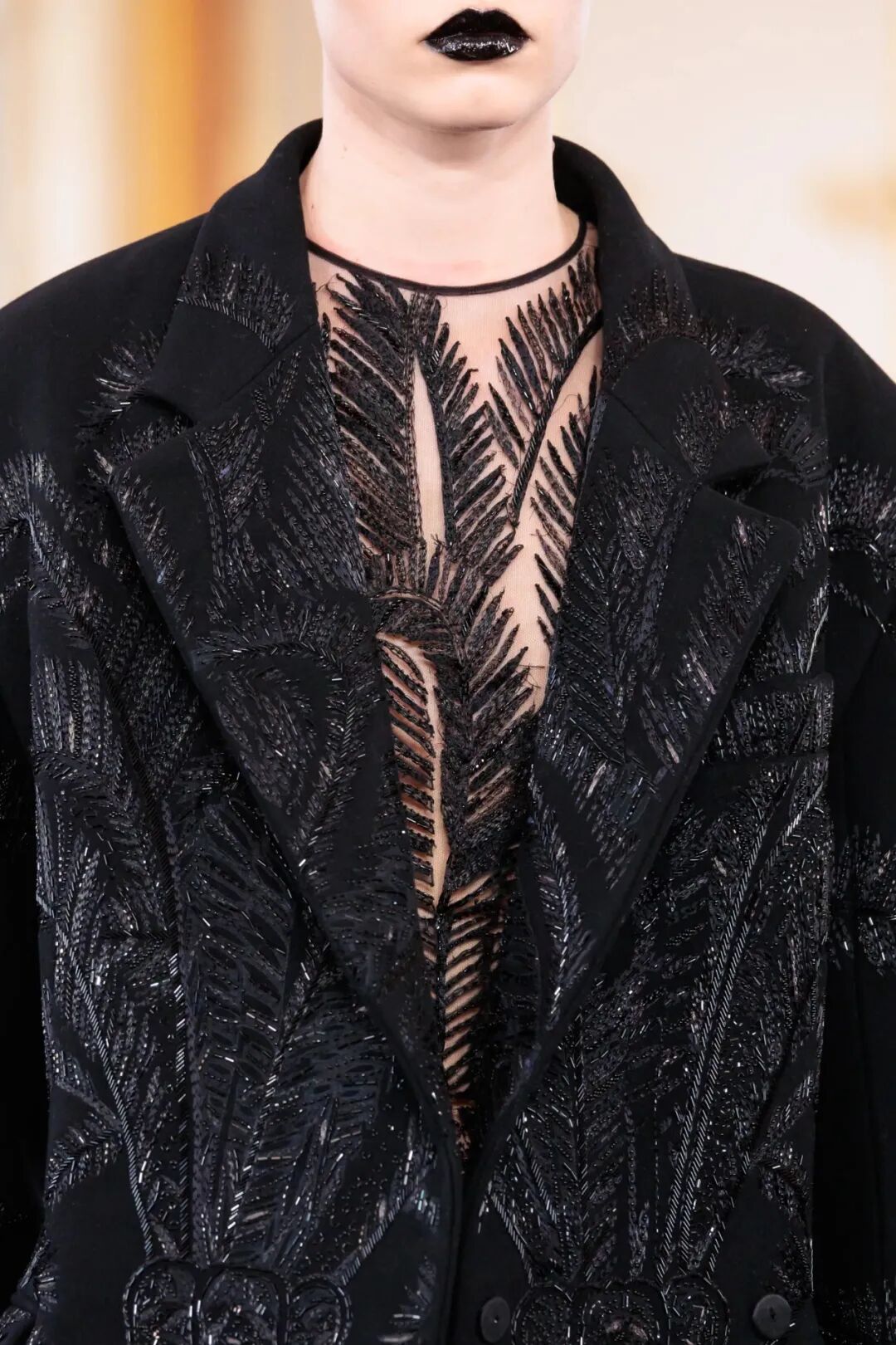 细密的银色串珠刺绣不仅是将鸡尾酒裙赋予闪亮的光彩,仔细观察绣片的走向和纹路,银色的排布如同宠物猫毛般顺滑流畅地交织着,织物中模拟的猫眼水钻揭示了这一点。而紧接着的一系列套装造型中也包含了毛皮暗纹,剪裁的精良处理延续了Matthew M. Williams所坚持的高定情怀。而在致敬经典之余,Givenchy也在试图将传统高定语言进行糅合,比如西服套装胸间隆起的礼服式支撑结构,或是以粗棒针织打造的收腰背心,都让整个系列从尘封的历史档案中跳脱出来,将品牌专属的优雅风格延续到新的世代。