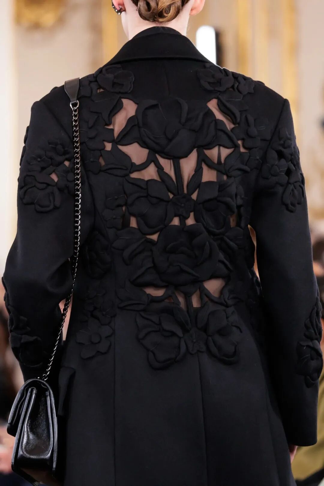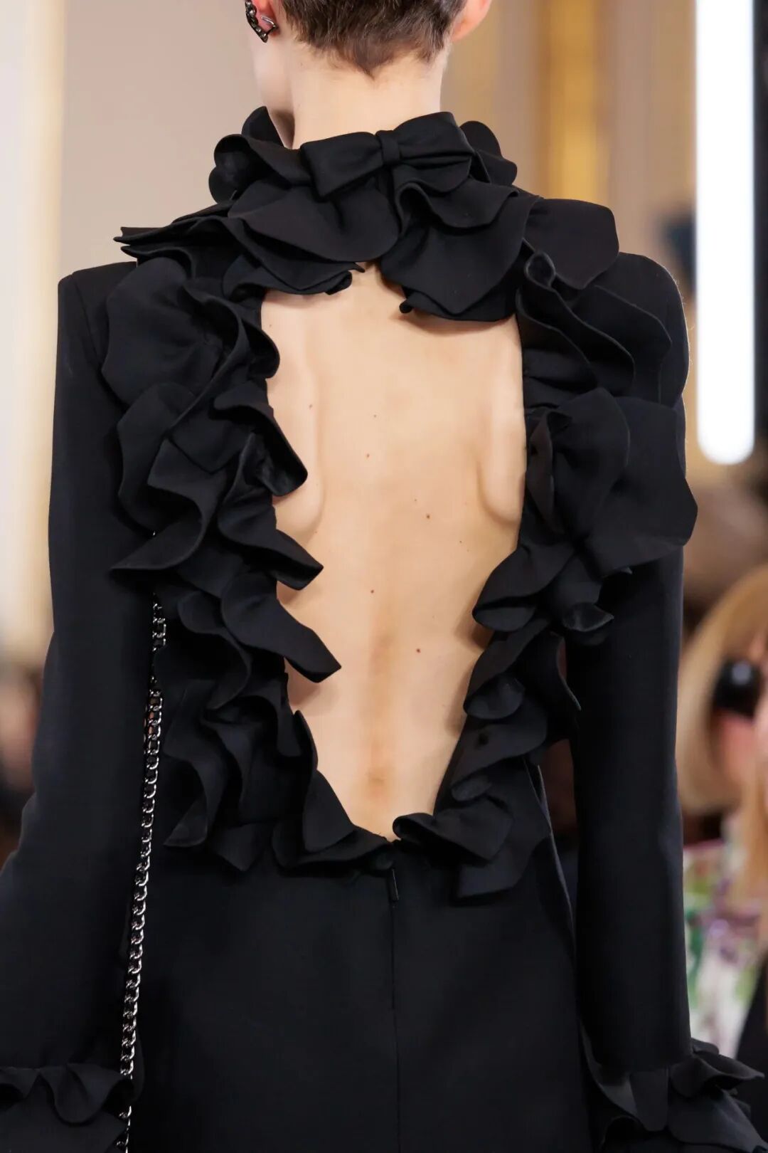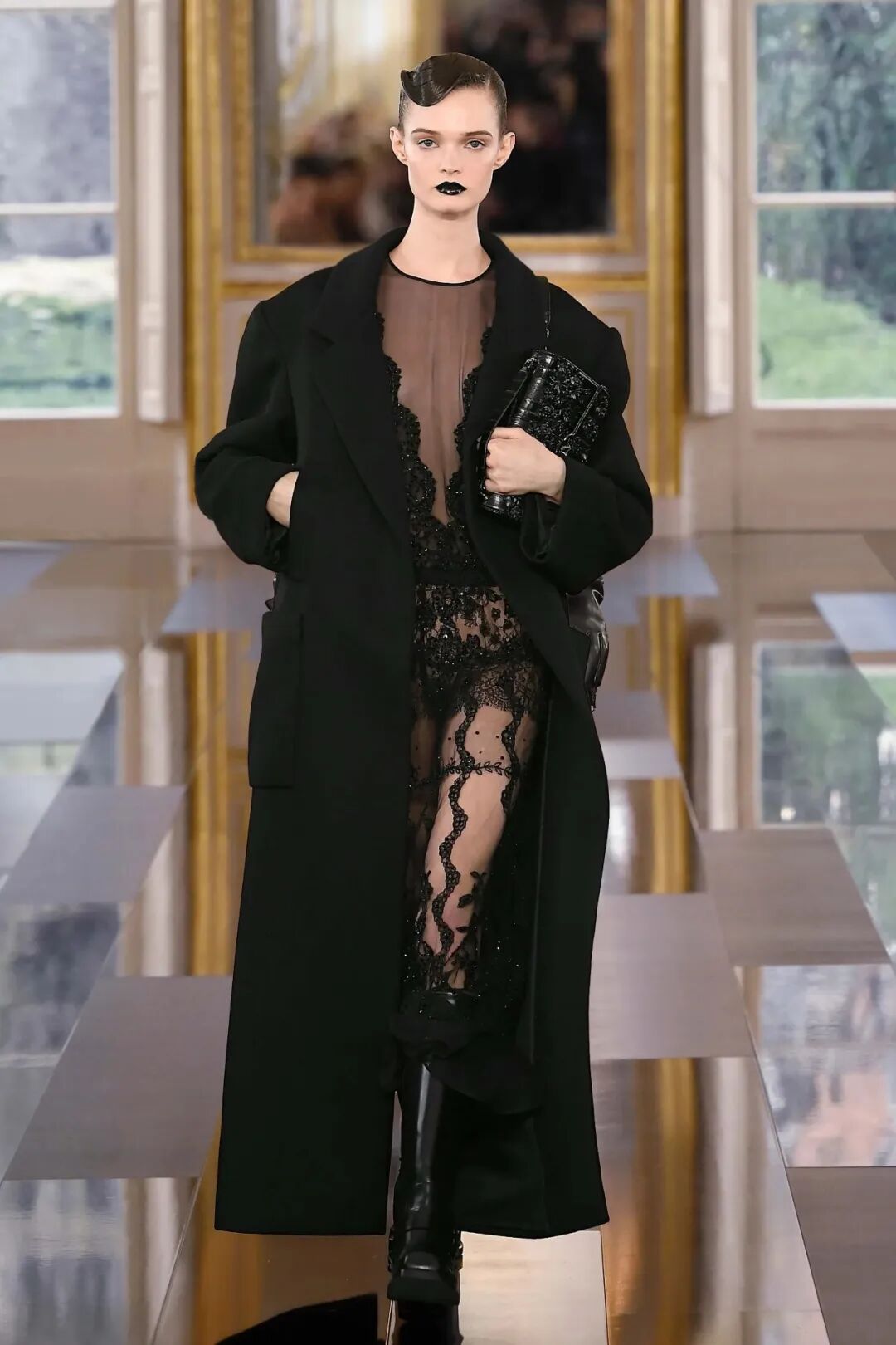 从某种程度上而言,黑色在秀场上并不讨巧,深邃的底色往往会隐藏起诸多细节,但也正因为如此,黑色反而能够彰显出最本质的功力。Piccioli将其视为对自己的挑战,也是在为Valentino梳理崭新的制衣准则。品牌标志性的褶边、雪纺和蝴蝶结元素悉数登场,呈现在外套、连衣裙、套装的每一处细节之中,63套造型仅以黑色塑造出了时装设计中的无限可能性,从轻薄纱质到厚重的毛呢,从传统的剪裁到新式的镂空,Piccioli自如地变换着制衣手法,打破结构、廓形与装饰的界限,将三者的功能性与视觉效果相互交融,呈现出一个值得反复回味的系列,再次证明了Valentino在时装界不可撼动的地位。