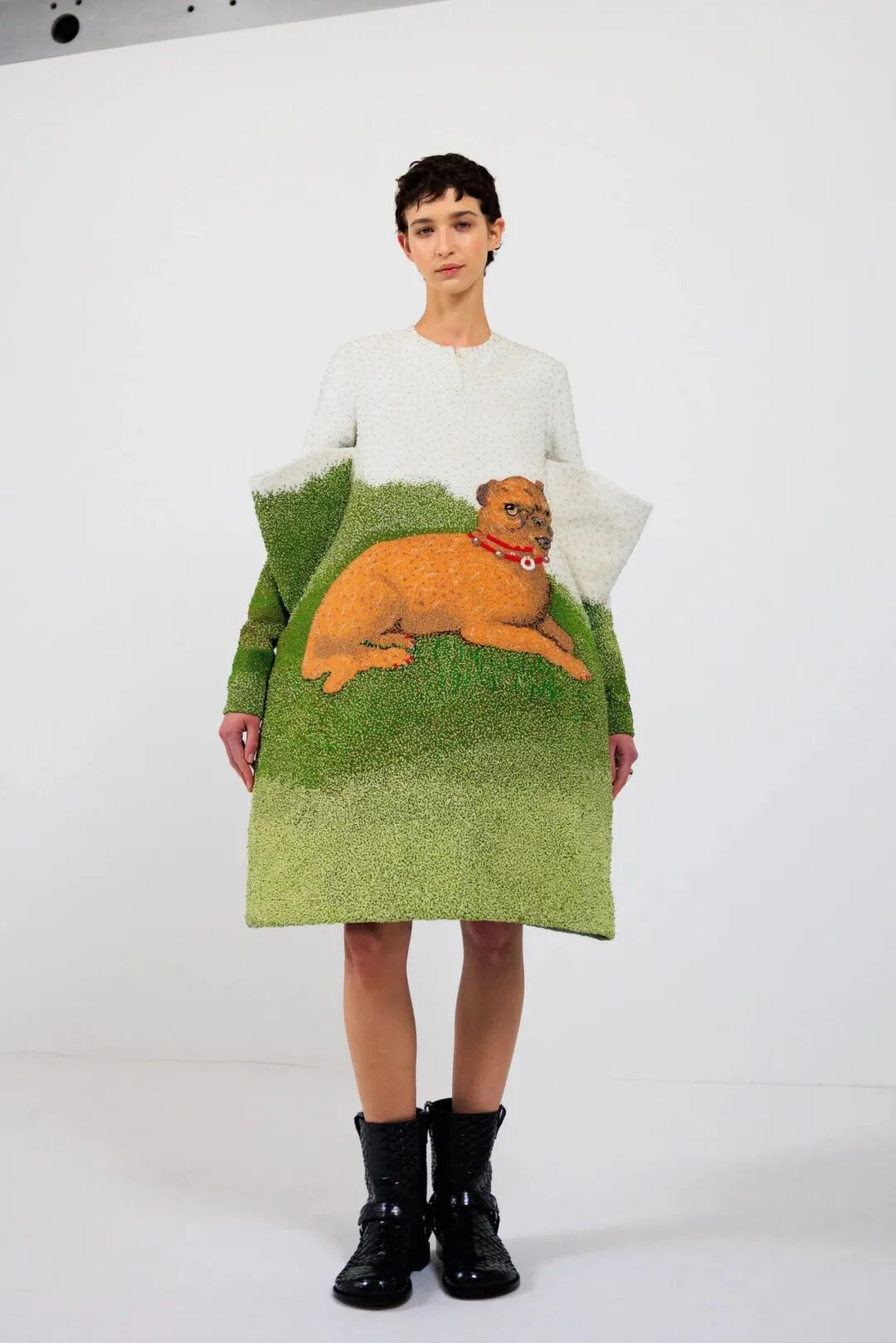 Anderson热爱传统手工艺,更热衷于以现代视角解构古老技艺中的精髓,使之成为当下人们喜闻乐见的趣味。就像在新系列中他所做的那样,将已故艺术家Albert York作品中的图案复制到面料上,爱犬形象、花卉和自然景致以手工刺绣方式呈现于服装、鞋履与配饰之中,而看似柔软细腻的毛料衣领,实则是由胡桃木材质打造,三位工匠耗时逾1000小时才将其雕刻完成。“在这个系列中,我开始探索起源的概念,以及我们为什么买东西,为什么东西会有意义。”Anderson解释道,“我以一个局外人的视角观察那些我们未曾经历过的世界。”而结果是,这些未至之境,经由工艺的演绎,成为现代人为之惊叹的杰作源泉。