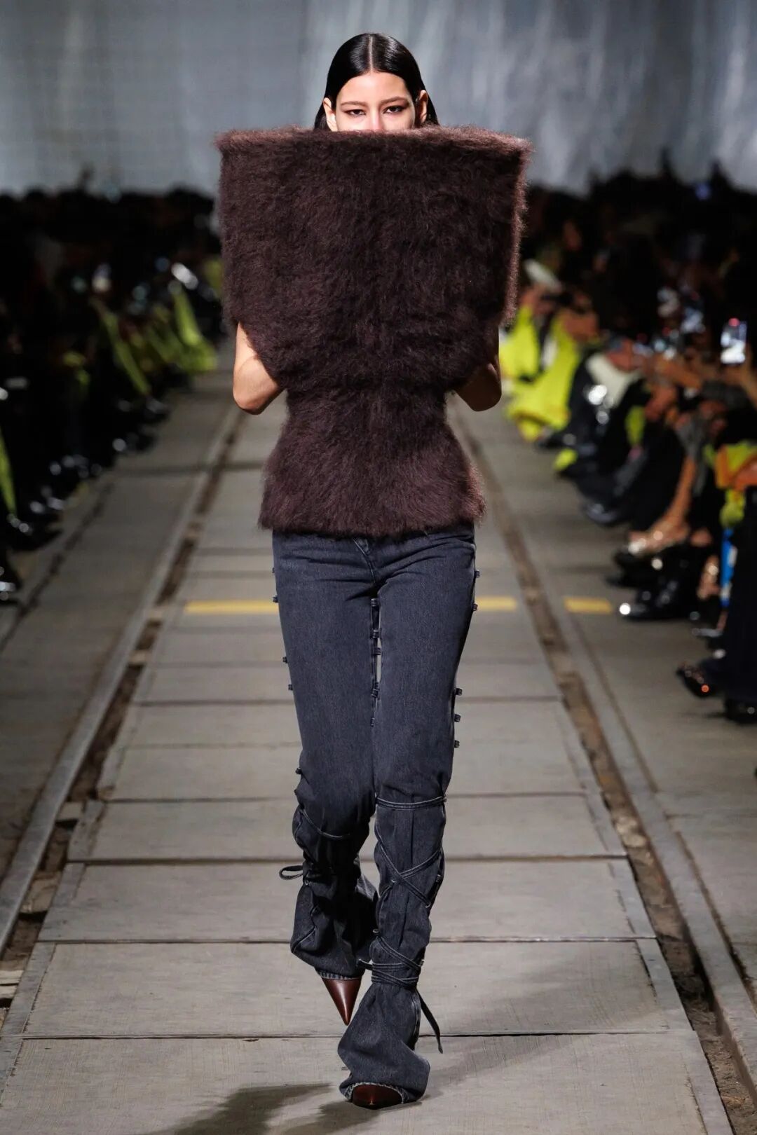 开场造型是一款McQueen风格十足的黑色扭曲层积针织面料垂褶裙,是McGirr从品牌1995春夏系列的设计中探寻到的灵感,“我试着把这种压缩廓形的想法进一步推进,看看能为现实的衣橱做些什么。”诚然,我们看到了更多在日装造型中变体的细节,比如轮胎纹路般的多层领口套头毛衣、箭形胸针装饰的双排扣精裁大衣、鸟尾廓形的皮领外套,以及手工编织的羊毛连帽漏斗领毛衣,让McQueen不再只是被人们仰望的时装臻品,更是能够穿上身的造型利器。当然,秀场尾声出现的镭射切割碎屏效果连衣裙和钢材汽车裙也赚足了人们的眼球,但这或许都只是McGirr的预演和前奏,我们期待着他在McQueen绘制出更为完整的蓝图。