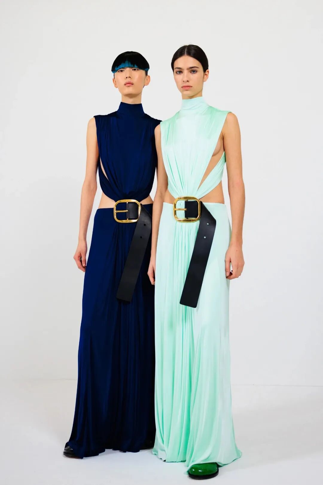 Vaccarello联想到了Yves Saint Laurent先生在60年代创作的一系列透视衬衫和透视礼服,即便在如今,那些设计依旧具有浓烈的挑衅意味,“现在有太多的时装、太多的事物看起来都是一个样子,我希望做出一些之前没有出现过的东西,”Vaccarello在后台解释道,“我的工作并不总是需要做一些实穿或者反应现实的设计。”于是,他将整个系列化作了一场透视盛宴,从灰褐色、焦糖色,到橄榄色、赭石色,乃至棕色、朱红色,各种浓郁的色彩席卷了轻盈贴身的薄纱材质,模特们的身体曲线在服装中若隐若现,成为造型中的重要组成部分。与此同时,以弹力面料制作的头巾、透明材质的宽手镯,也为整个系列画上点睛之笔,在经历了一整个时装季的大衣攻势后,Vaccarello的透视风情无疑令人再次惊艳法式时装风情的无穷魅力。