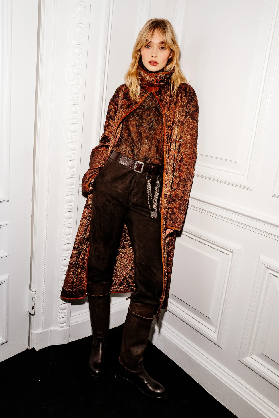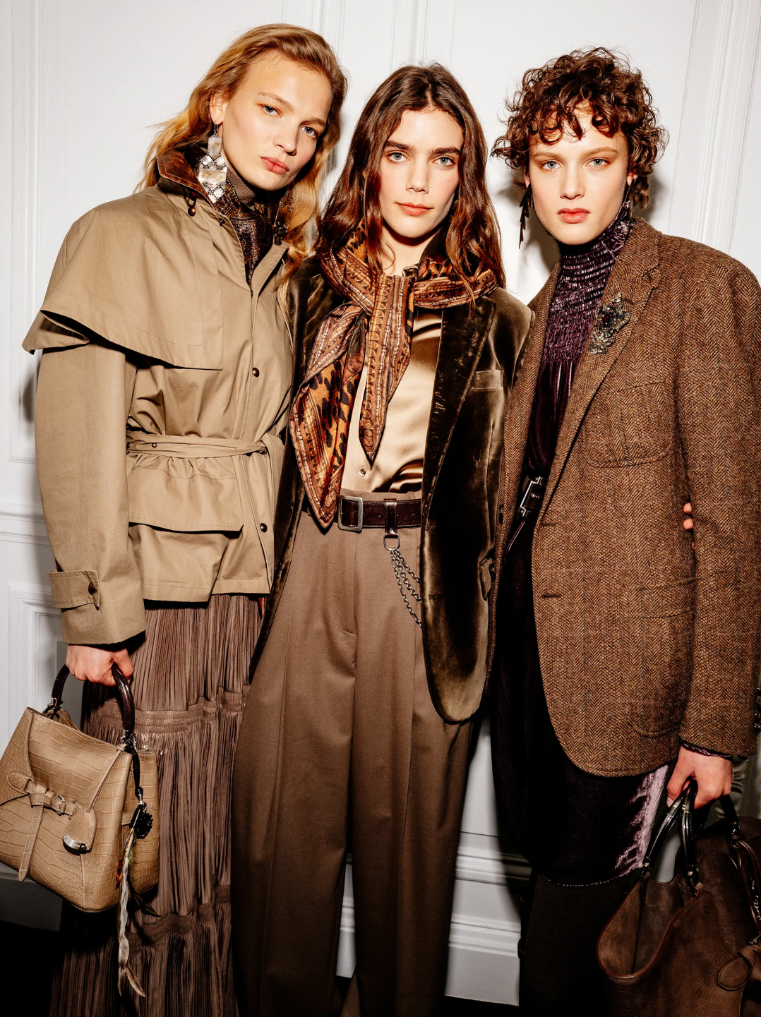 为此,Lauren先生投入了更多超越成衣标准的心血和精力:超过五十种定制面料的运用,包括粗花呢、天鹅绒、提花、精致刺绣、醒目丝巾印花及各式皮革与剪羊毛的混搭组合,为造型提供了丰富的视觉层次,与秀场墙壁上装饰的手绘森林风景油画和地板上铺陈的东方风格古董地板遥相呼应,让所谓的“静奢”肌理不再等同于低调素雅,它可以尽情张扬野性而浓郁的底色。