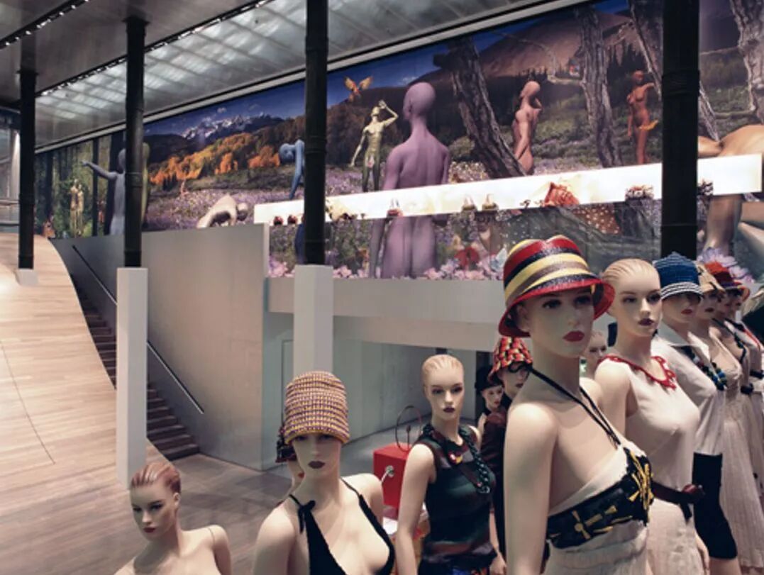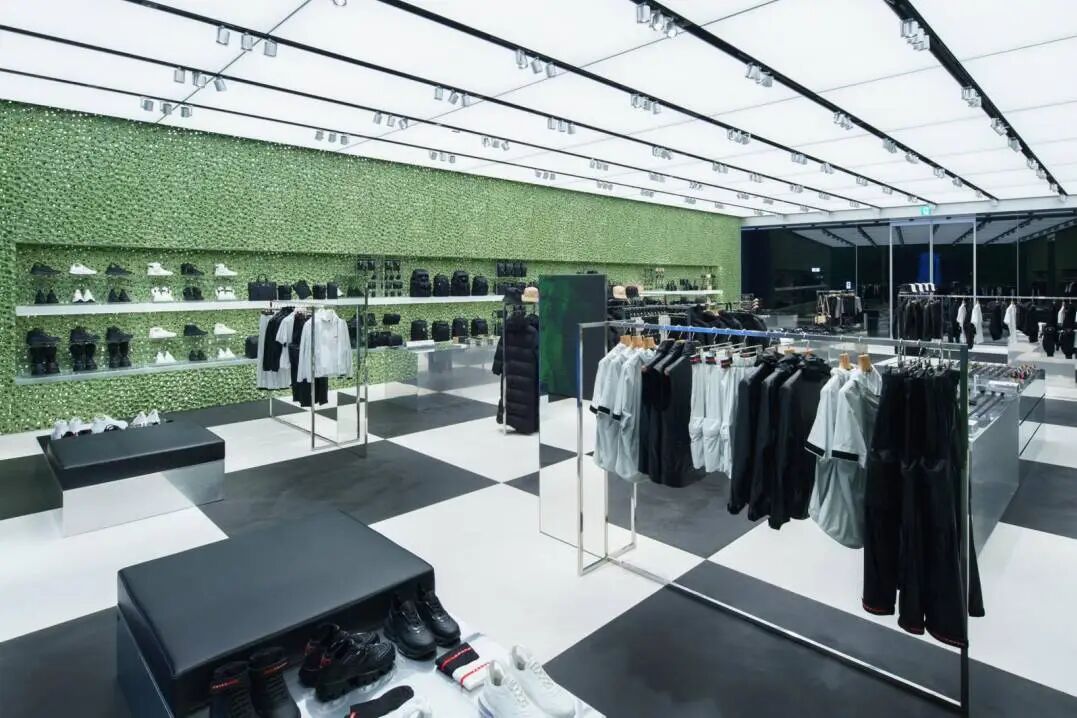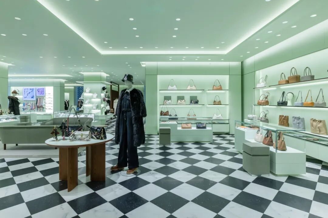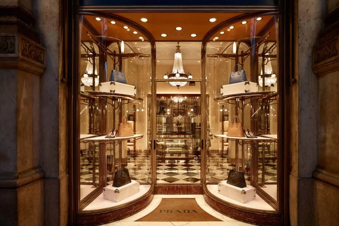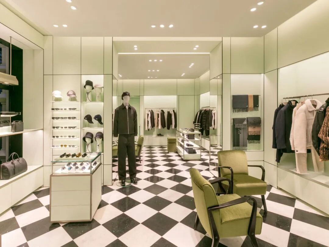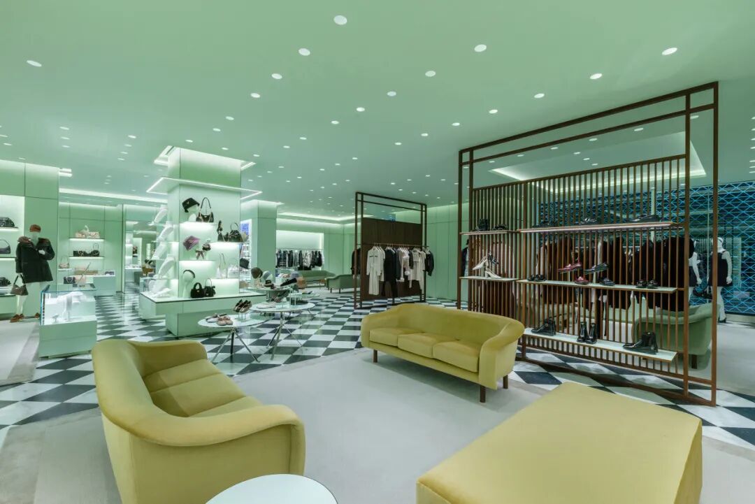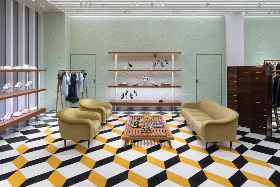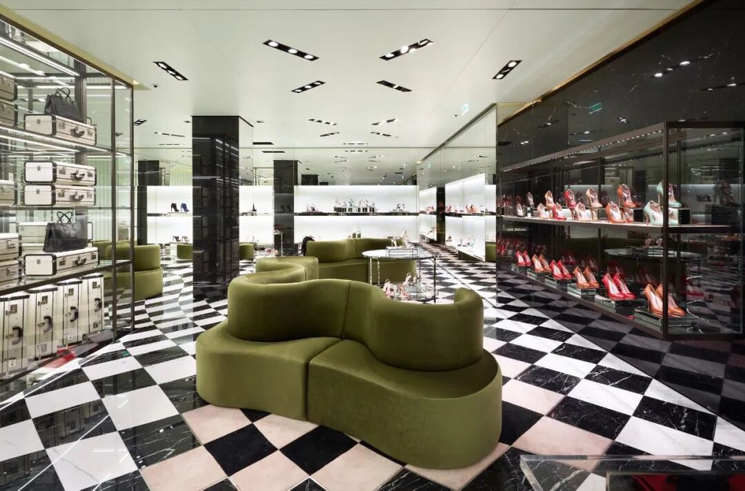 而这一几乎可以在所有Prada门店中都可以找到踪影的设计,其实灵感来自于品牌自身的历史:这个由Mario Prada于1913年成立的品牌,创办不久后便在米兰最著名的地标伊曼纽尔二世长廊内开设了专门售卖优质奢华旅行装备及配件的精品门店。黑白方格设计的大理石地板,便从这家精品店的进门处一直延伸至室内。在此前于上海星美术馆举行的《Pradasphere II》展览内,讲述品牌与建筑关系的展室里,同样可以寻找到这一标志性的地面纹样。 Prada开设于伊曼纽尔二世长廊的精品店内部 《Pradasphere II》展览内部空间 黑白方格作为品牌的标志性符号之一,自然也得到了除了经典之外的多元诠释。譬如在位于迈阿密设计区(Design District)的店铺内,黑白方格在室内渐变成了有着黑白黄配色的立体错视印花,与空间内20世纪中期巴西现代主义风格的家具共同谱写着摩登都市、充满活力的设计语言。又比如在位于东京宫下公园的店铺里,建筑事务所OMA将地板的黑白方格放大,用更加简约、冷峻的建筑语言来赋予经典当代气息。 迈阿密设计区的Prada门店 东京宫下公园的Prada门店 地板之外,近似于薄荷绿的墙体,同样也是Prada门店的一个标志性设计语言。在这个绿色的空间里,精心挑选的家具同样体现着建筑美学。除了先前说的在迈阿密设计区店铺里的巴西中古设计家具之外,你同样也可以在许多门店里看到由已故丹麦建筑师、工业设计师Verner Panton打造的色彩、大小各异的Cloverleaf系列沙发。值得一提的是,在此前品牌2019春夏男装女装系列的秀场空间里,AMO还将这位设计大师于1960年代推出的透明充气座椅进行了复刻。 Prada门店中的Cloverleaf沙发 Prada 2019春夏秀场上的 Verner Panton透明充气座椅 不仅如此,Prada还通过建筑的手法来革新购物的体验。在2000年代初,Prada携手OMA一同于纽约SoHo打造了首个Prada Epicenter旗舰店项目,打破了传统的零售店设计,整个空间由波浪形的“The Wave”设计构成。在波浪的一侧,大量的阶梯给商品提供了陈列的空间,并可供客人入座休息。另一侧则放置了一个舞台空间,让坐在对面阶梯的客人可以直接欣赏到位于舞台上的演出、讲座甚至是电影播放。店铺不再仅仅只是一个“卖货”的场域,它同样变得充满文化性和互动性。 Prada纽约Epicenter旗舰店 不难看出,在店铺设计上,Prada从来都不是墨守成规的,时而前卫,时而经典,你能从中感受到的是一种基于文化和地域所带来的因地制宜——迈阿密设计区店铺的装饰呼应着这一区域的设计文化;宫下公园店铺的设计维持了这一区域里简洁未来的语言基调;纽约的Epicenter旗舰店,充满戏剧性的场景也呼应着旁边百老汇的娱乐精神。 在Prada最新举办的北京SKP精品店重装开幕酒会活动上,我们同样可以看到品牌在北京这一百货商场里对精品店所作出的一系列因地制宜的改造。以一层颇为醒目的女士精品店威力,在这一占地近374平方米的空间里,展售着成衣、皮具、鞋履和配饰。背光设计打造明亮大气的外立面,呼应品牌徽标的经典三角形由金属材质打造,奠定全新精品店的概念。