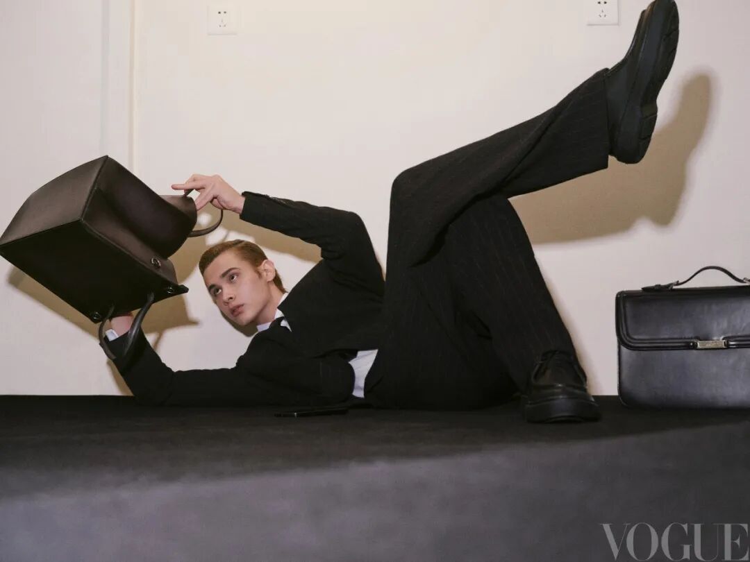 黑色条纹西装、黑色条纹长裤、白色衬衫、黑色皮鞋 均为 Giorgio Armani 黑色皮包 Berluti 黑色公文包 Bally
