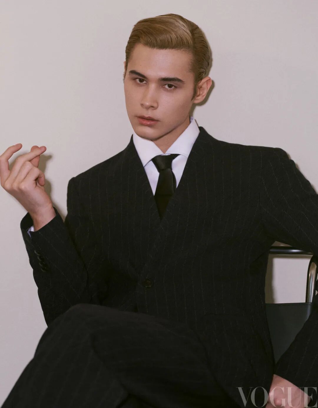 黑色条纹西装、黑色条纹长裤、白色衬衫