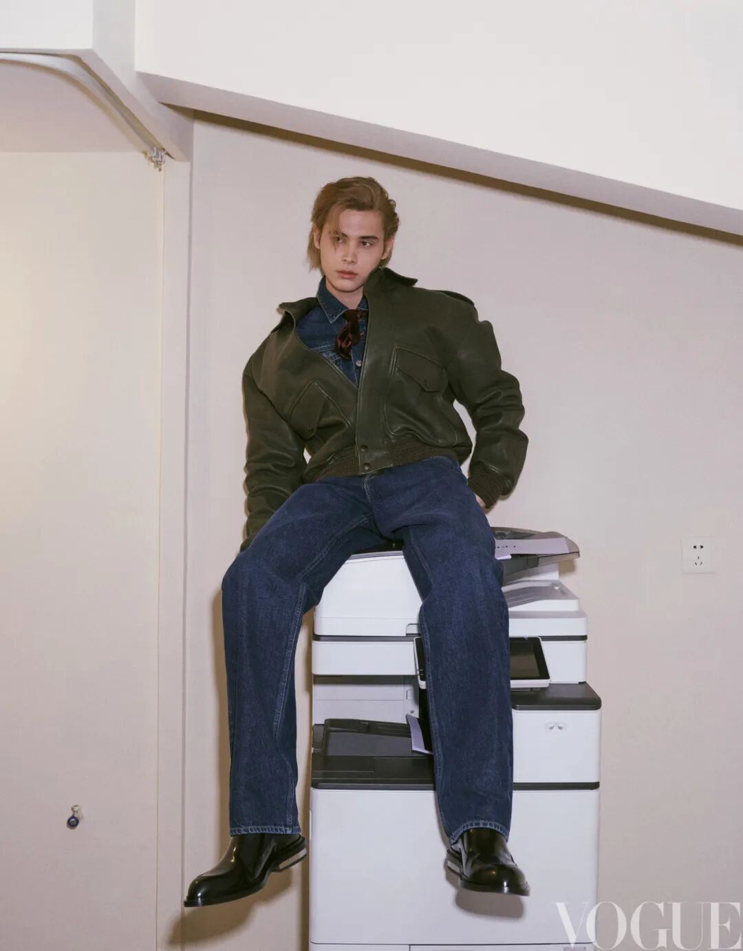 军绿色皮质夹克 Burberry 蓝色牛仔上衣 Cplus Series 蓝色牛仔长裤 Arket 黑色皮鞋 Jil Sander 酒红色丝巾 Zickness