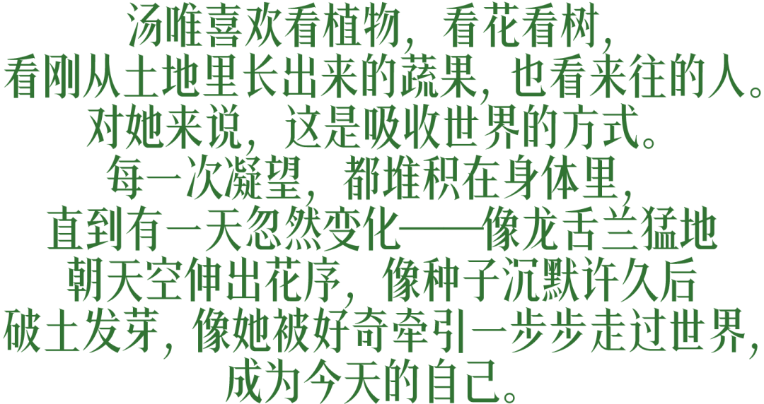 汤唯一直喜欢看植物。走路的时候,看花看树,也看路边野草。“有花就看花,有菜就看菜,”她笑着说,“反正什么都爱看。” 这种习惯可能和她成长的城市有关。汤唯在杭州长大,她常在西湖边散步或骑车,有时安静地望着湖面。柳树的枝桠垂到水面,风拂过,枝头点起涟漪,树影轻轻晃动。这是她对这个世界好奇的开始。 等她离开杭州,在不同城市生活,好奇也带着她走过这些城市的街道,看过各色风景。在深圳的一年,空气湿润,植物长得快,很多树一年四季都是绿色。过年时有花市,摊位一排排铺开,鲜花绿植密密地摆在街边,人群在中间慢慢走动,颜色、气味混在一起,整条街看起来像一座过年才长出来的花园。