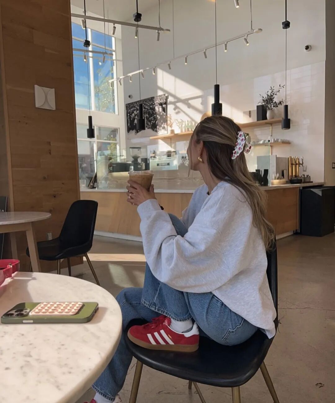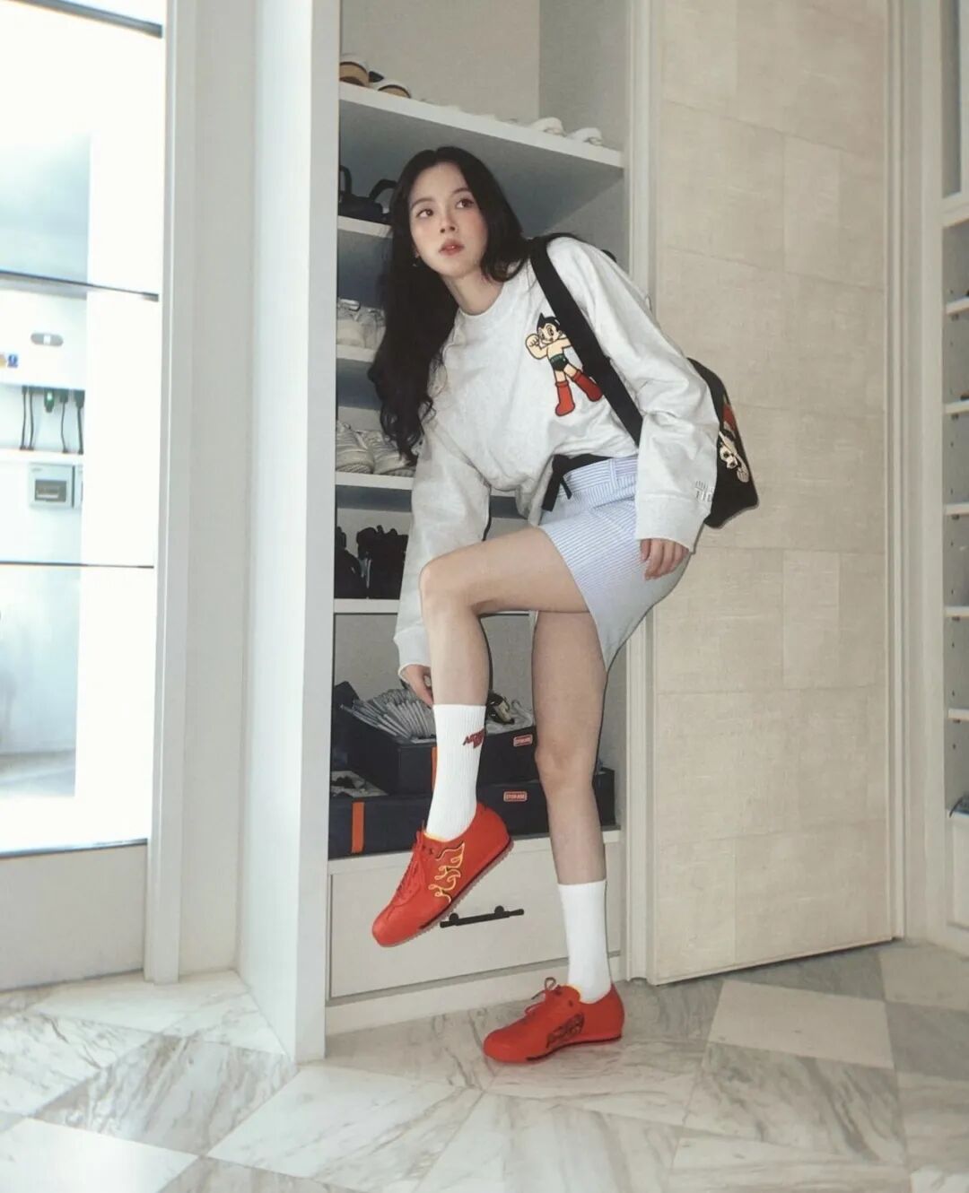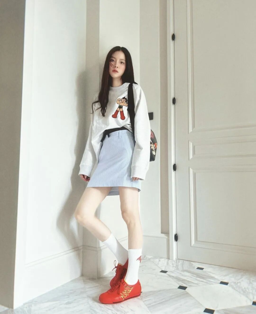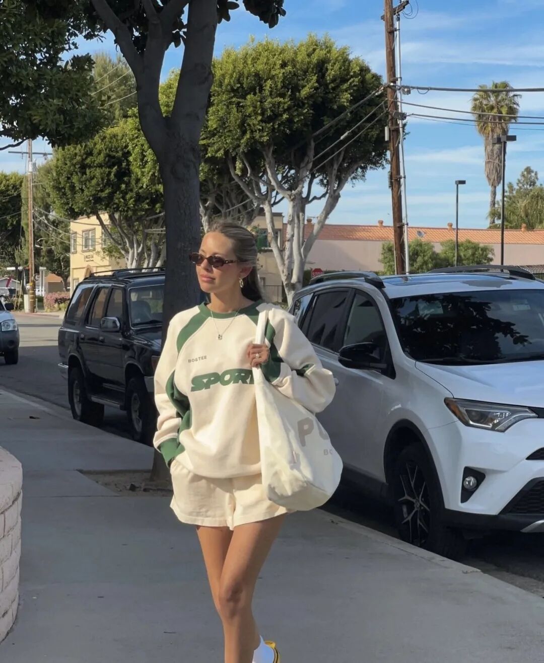 如果并没有一整套卫衣套装,却仍然想穿出这种套系感,也可以选择带有卫衣部分颜色的下装来上下呼应,这种穿法,基本不用太多思考,也不会出错。