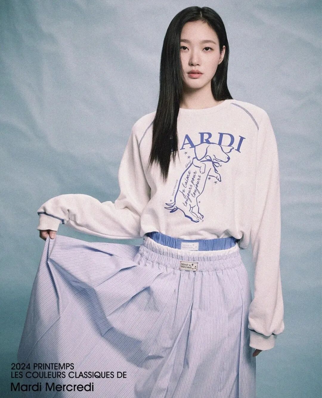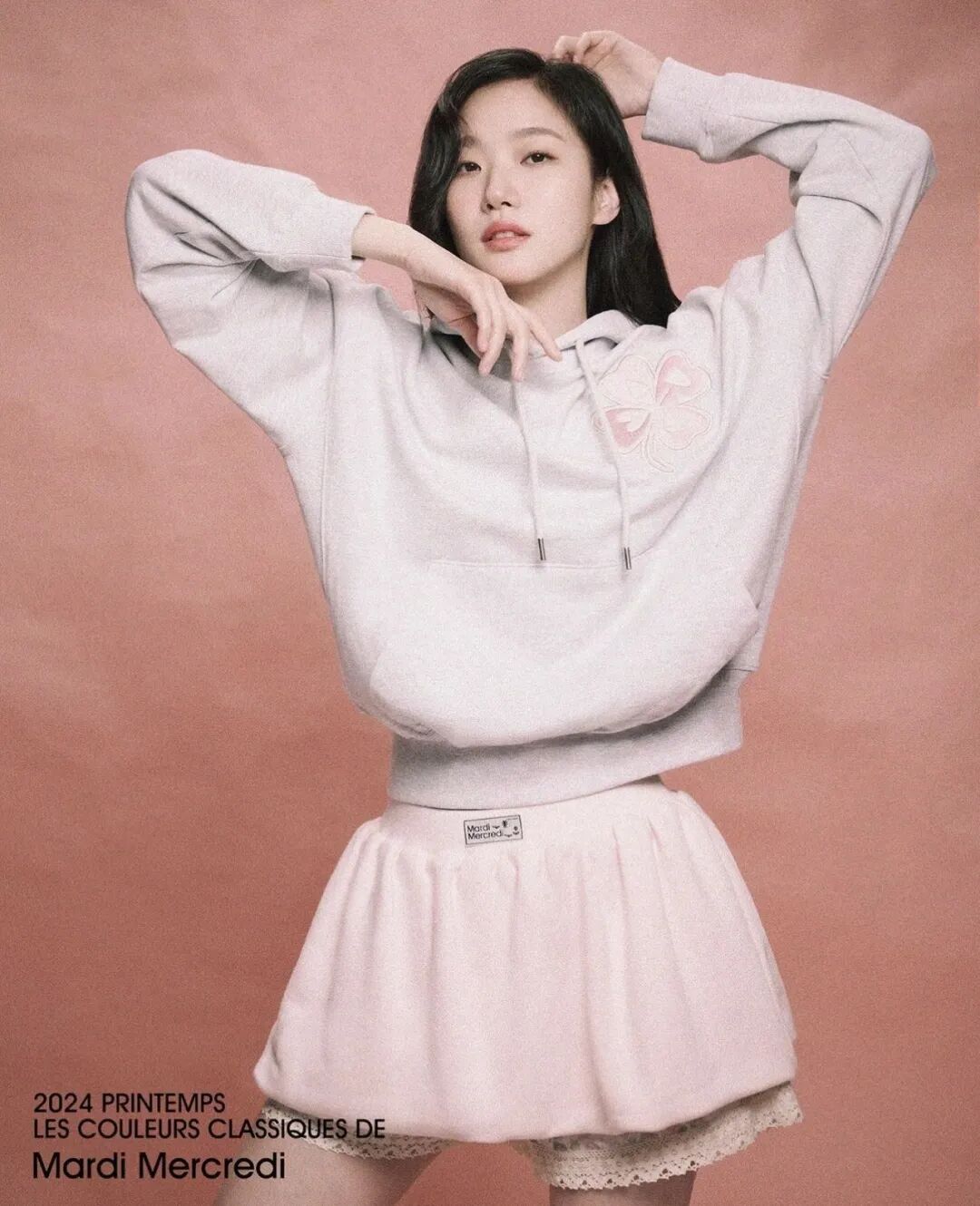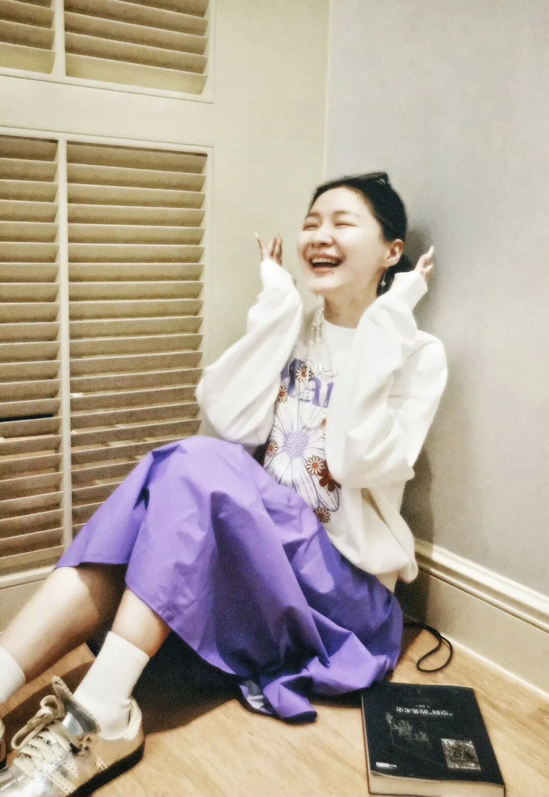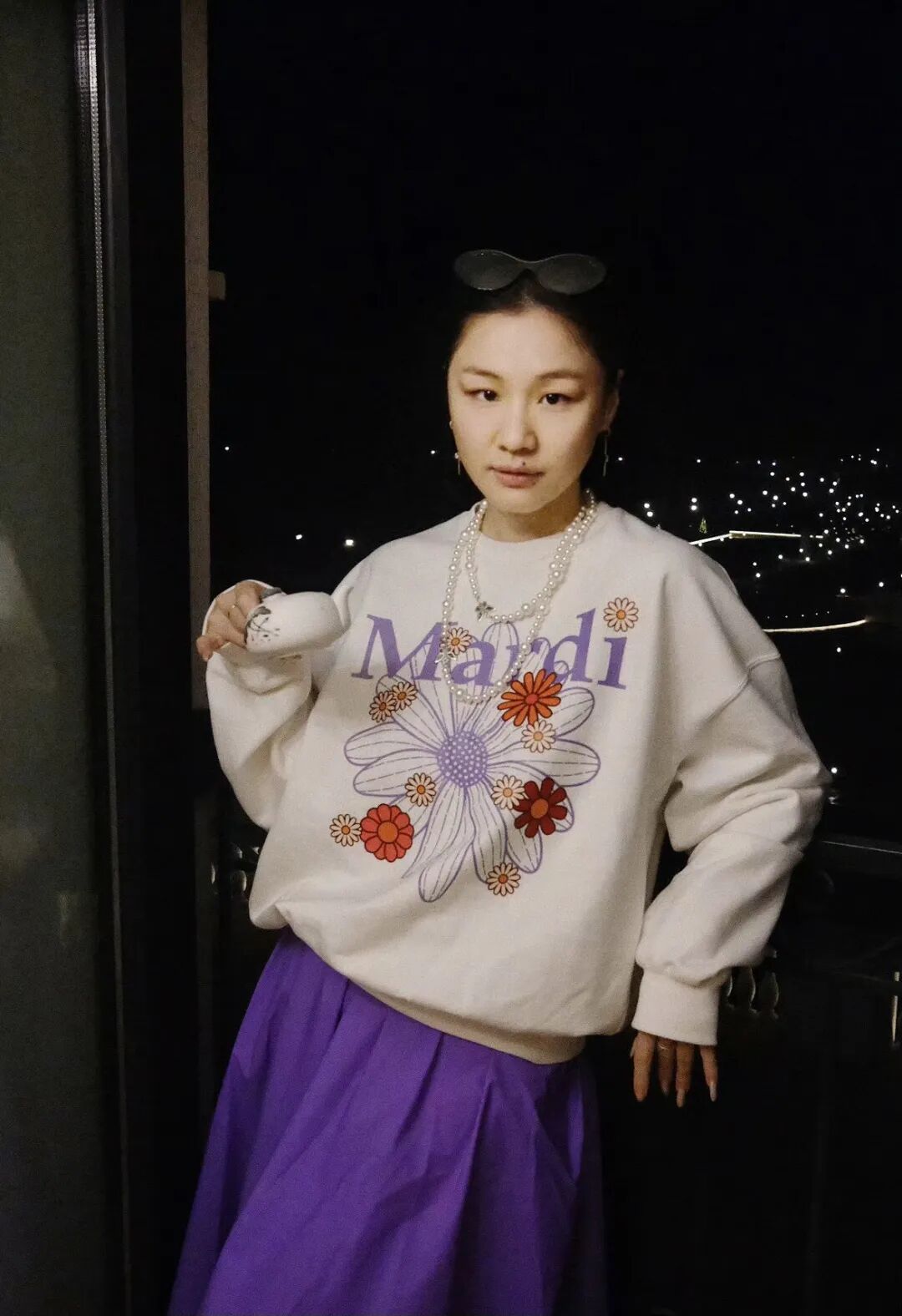 刚刚官宣怀孕的金靖,为她的Mardi卫衣搭配了一条紫色的长款半裙,裙装的颜色正好与卫衣上的印花呼应,还搭配了珍珠项链,立刻多了几分套装的精致感。