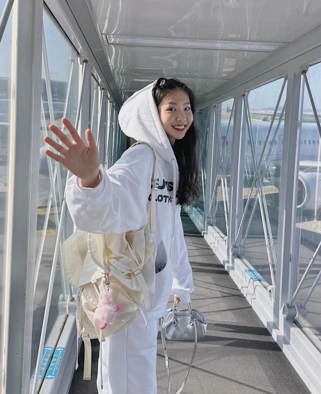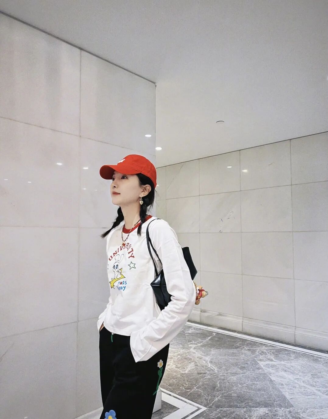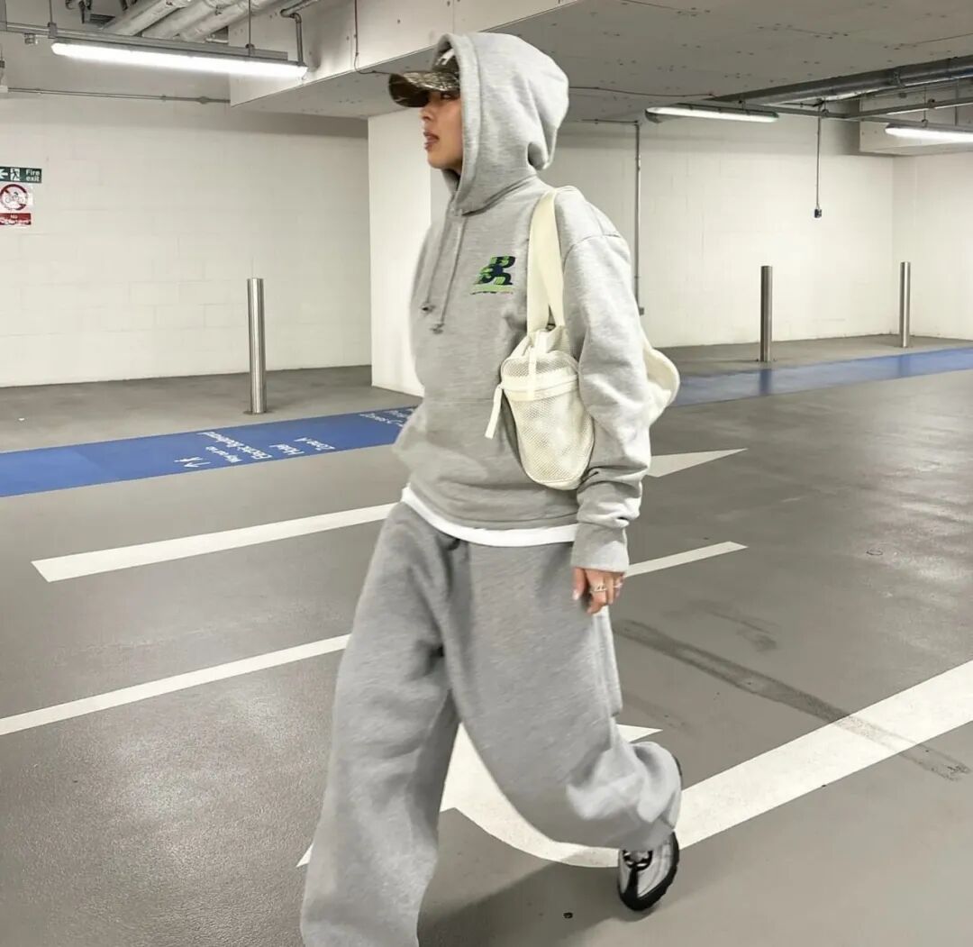 不过,当成套穿卫衣的时候,虽然很方便,但也有可能会把卫衣套装穿得像是校服一样。 这时候,最好加上一些配饰,来打破卫衣套装的高度统一性。 可以是颜色与衣服区分开来的包包;