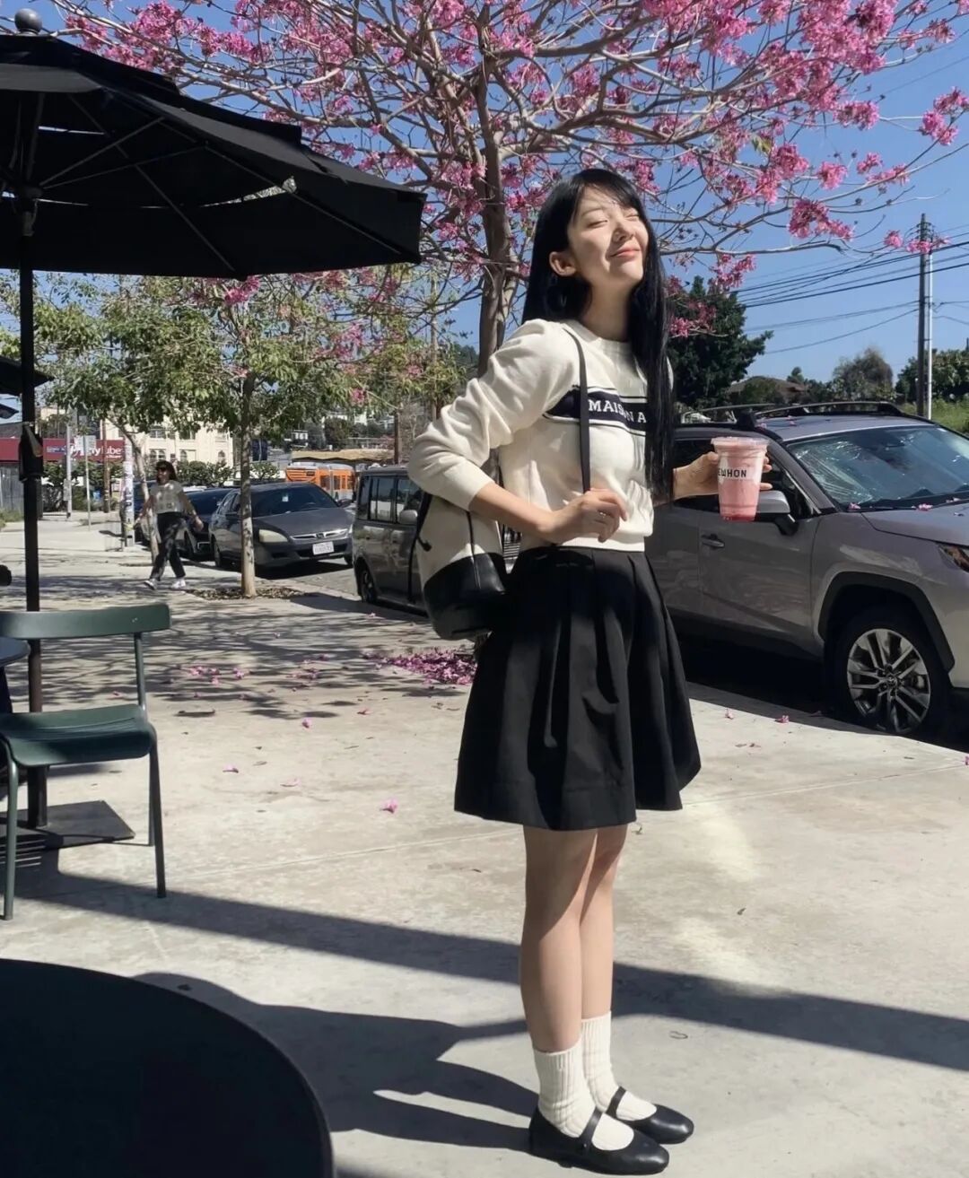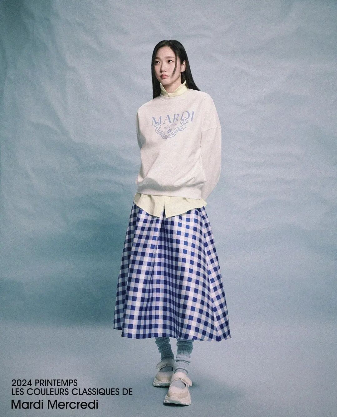 如果觉得这时候穿短裙还是有点凉的话,换成长一点的半裙问题就能迎刃而解。