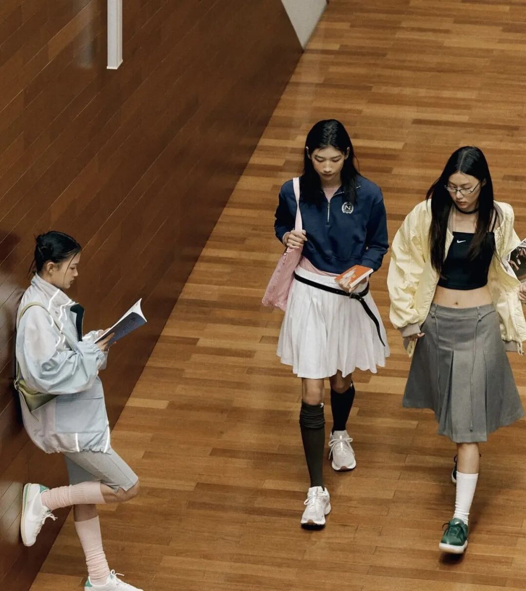 到膝盖长度的半裙更有一种制服感,尤其是搭配polo领的运动风格卫衣来穿的时候。
