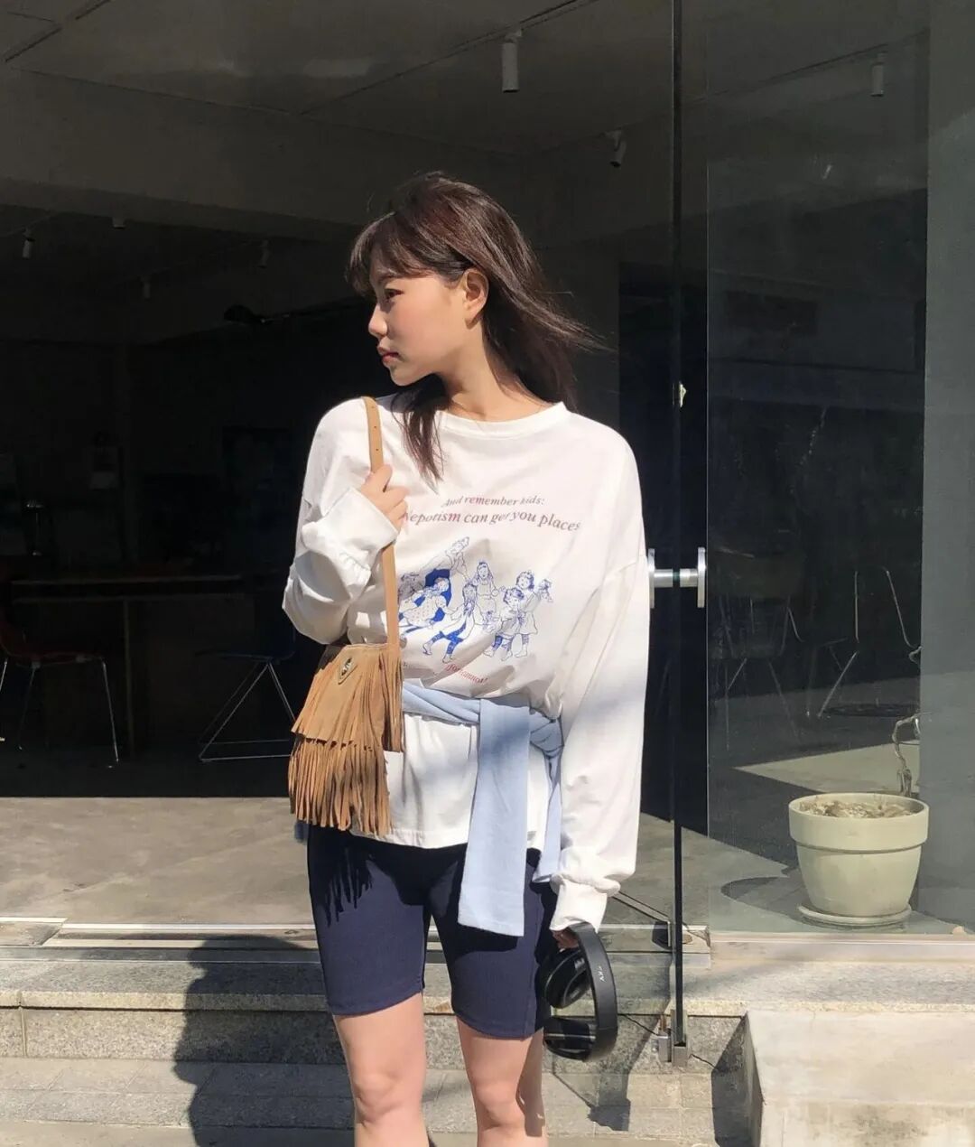 对于爱骑行的女孩来说,搭配一条骑行裤,也可以既舒适又好看。