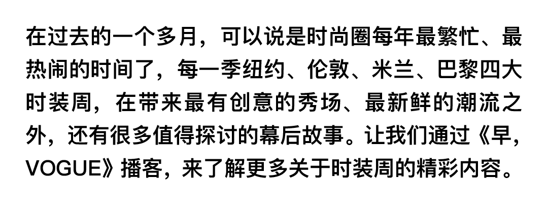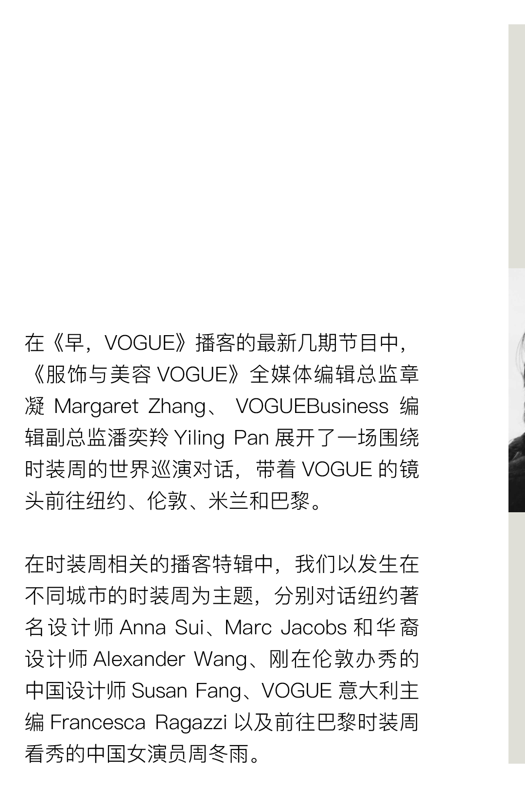 大家周一早。 随着热播剧《虎鹤妖师录》的放映,张凌赫饰演的祁晓轩以俊朗秀气的容貌和仁厚善良的性格进入观众视野,而在不久前,张凌赫也刚刚完成了他的巴黎时装周之旅,让我们一起走进他的巴黎清晨,感受他的生活瞬间。 想了解设计师的灵感从哪里来?本期内容将带你揭晓设计师灵敏的时尚嗅觉与灵感从何诞生。此外,与《早,VOGUE》播客一同探秘四大时装周,对话设计师与时尚界人士,了解更多秀场之外的幕后故事。 除了四大时装周,上海时装周也不容忽视,从上海街头去感受来自时尚界新势力的潮流时刻,寻找最适合你的穿搭手册。 复古热潮来临,90年代的珠宝趋势卷土重来,无论是Jennifer Lawrence佩戴的红色吊坠项链或是Brooke Callahan的玻璃吊坠项链等,都再次进入时髦精的视线,一起来围观吊坠项链如何玩转复古时尚...... 接下来,一起进入本期精彩内容。