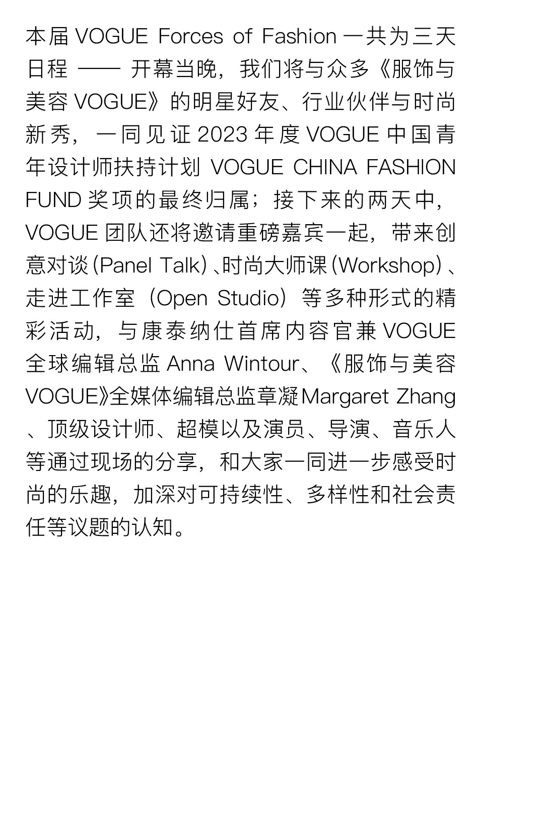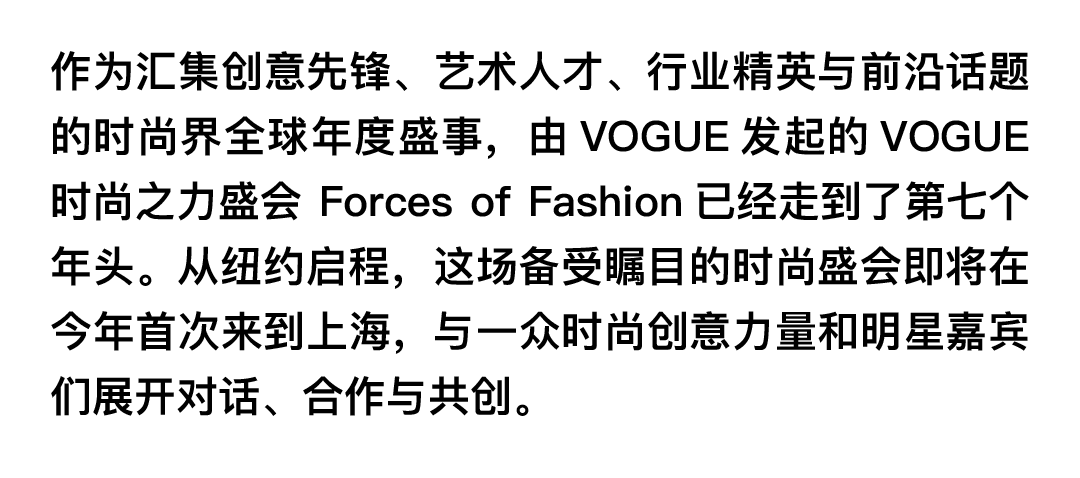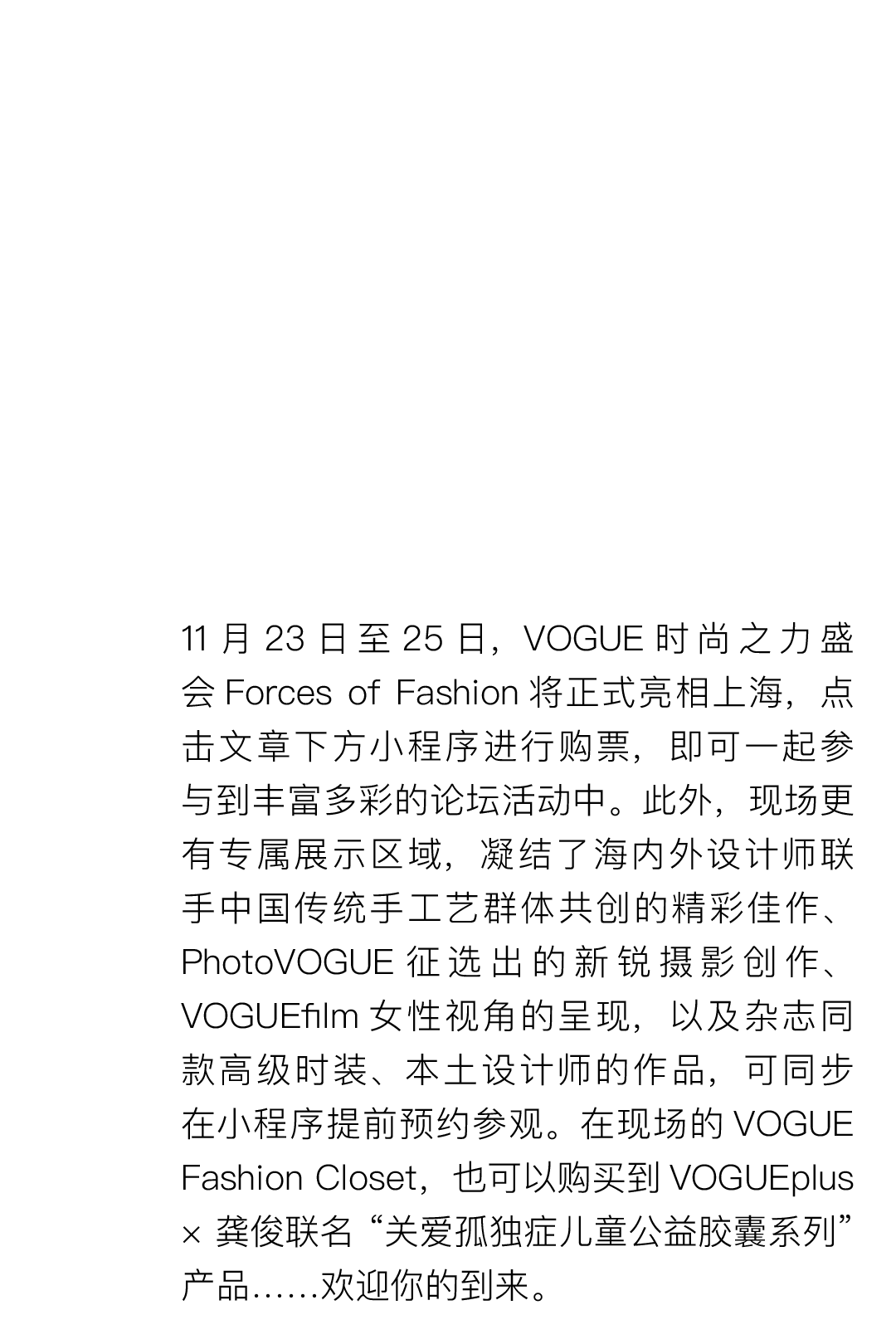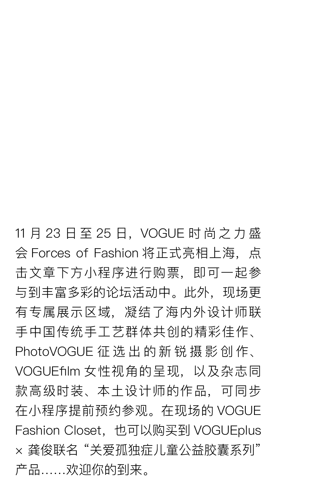 本周11月23日-25日,VOGUE时尚之力盛会Forces of Fashion即将登陆上海,期待你的到来。本周内容就到这里,我们下期再见!