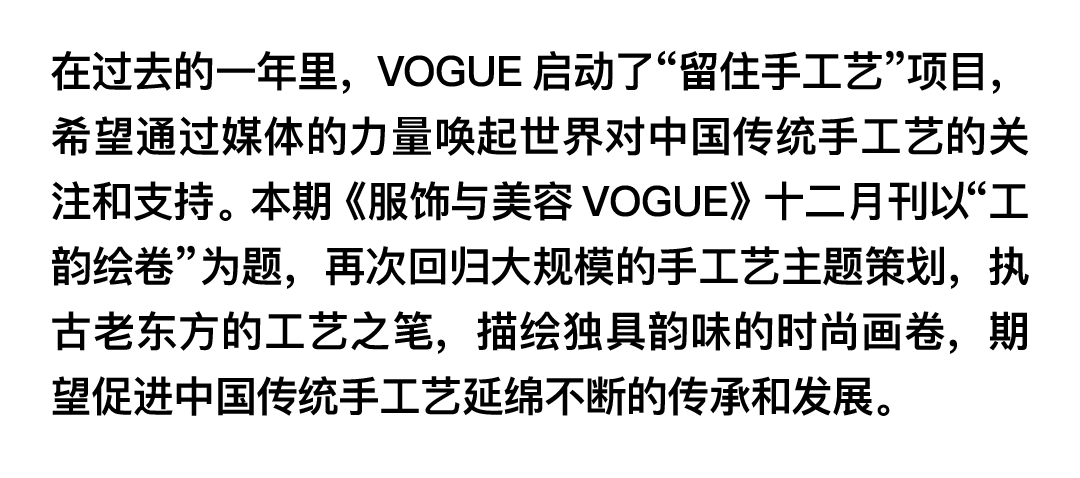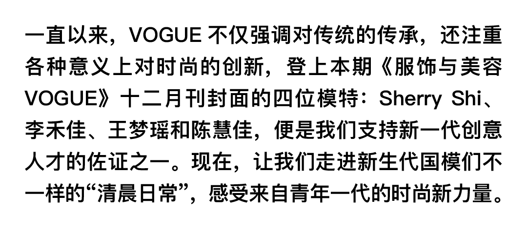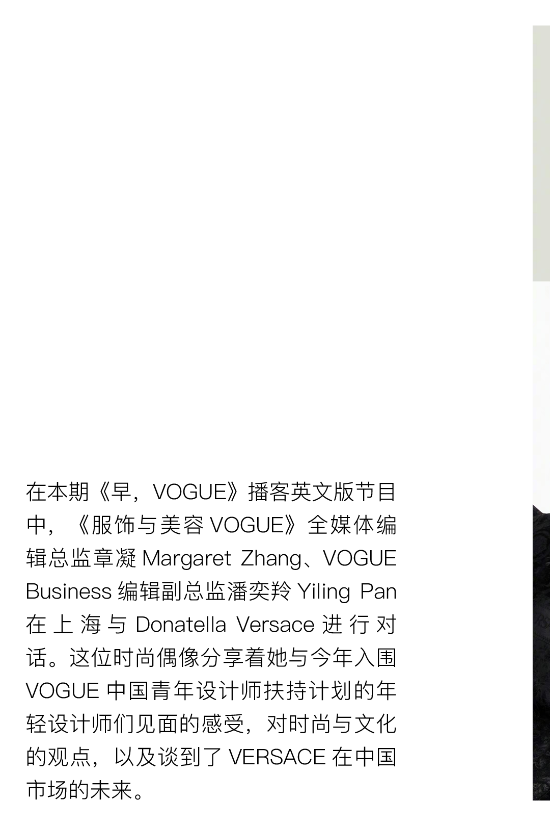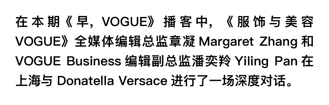 大家周一早。 本周《Good Morning VOGUE》,Sherry Shi、李禾佳、王梦瑶和陈慧佳——四位刚刚登上《服饰与美容VOGUE》十二月刊的新生代模特与我们共度清晨,这些一步步走到我们面前的时尚圈年轻血液,私底下是如何保持自律的?而本期《服饰与美容VOGUE》十二月刊,以“留住手工艺”项目为主题,再度唤起世界对中国传统手工艺的关注与支持。 在11月23日-11月25日即将登陆上海的VOGUE时尚之力盛会Forces of Fashion,也开启了一系列与“留住手工艺”、时装以及电影相关的活动,此外 ,VOGUE中国青年设计师扶持计划VOGUE CHINA FASHION FUND奖项的最终归属也将在此期间揭晓,与一众时尚力量、明星嘉宾加入到这场盛会中来。 在上周上线的《早,VOGUE》播客英文版节目中,我们邀请Donatella Versace进行了一场深度谈话,这位时尚偶像在最近的中国之行中,与今年入围VOGUE中国青年设计师扶持计划的年轻设计师们见面,这次播客中她分享着这次见面的感受,对时尚与文化的观点,并谈到了VERSACE在中国市场的未来。而在另一期中文版播客中,我们邀请了不久前担任VOGUE+十月刊客座编辑暨封面人物的龚俊,并一同回顾了他与VOGUE+共同推出的关爱孤独症儿童公益胶囊系列。 今年冬天,秀台上的流行色彩来到街头,希望这些颜色可以为你带来搭配灵感,而Priscilla Beaulieu传记电影《Priscilla》的上映也再次掀起爱心吊坠浪潮...... 接下来,一起进入本期精彩内容。