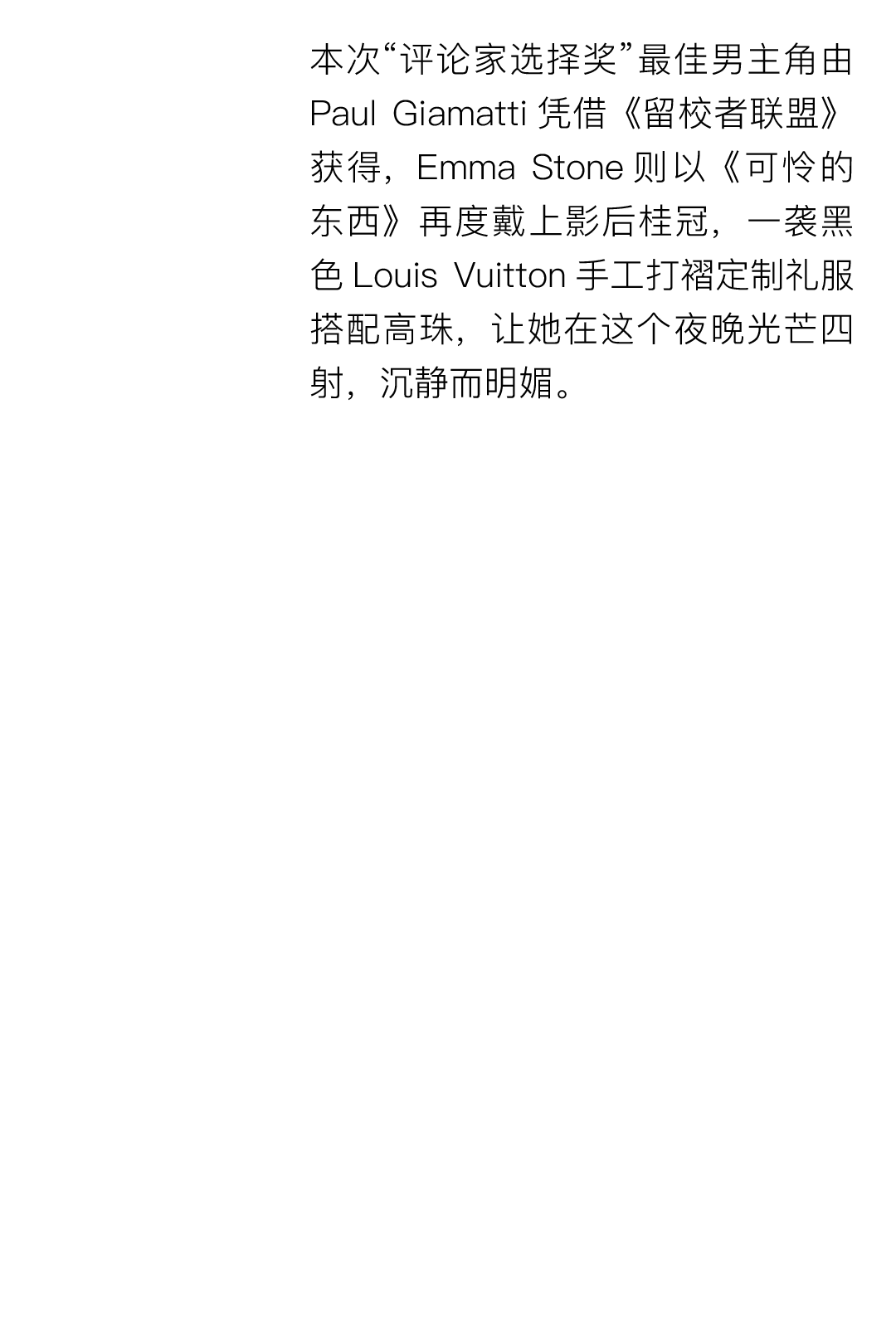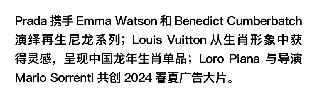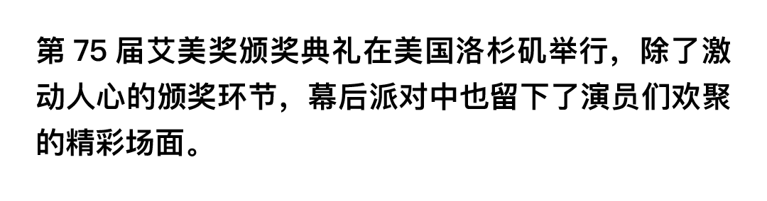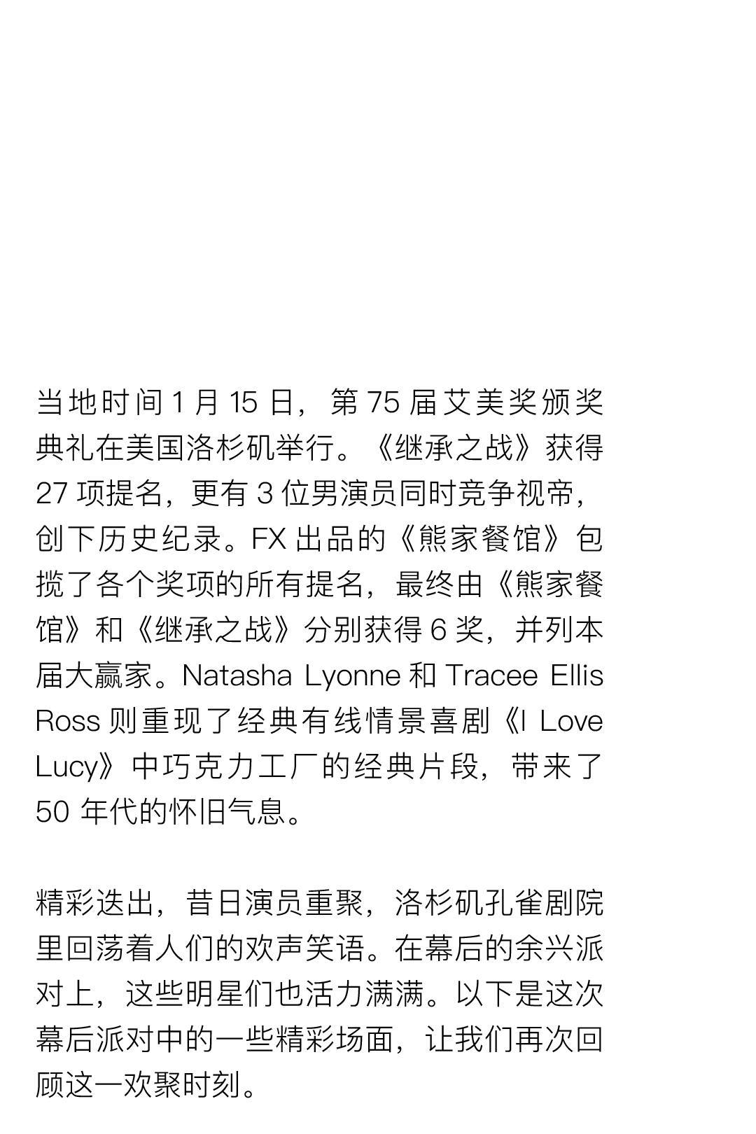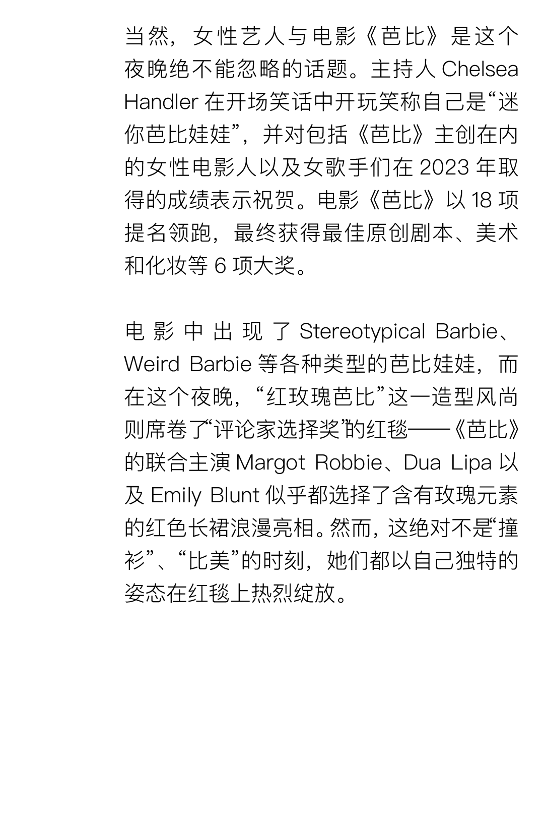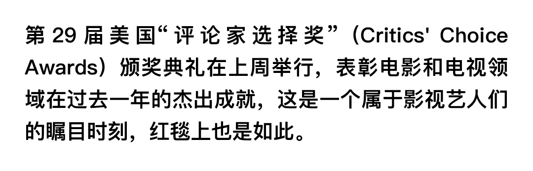 大家周一早。 电影《涉过愤怒的海》在院线取得不错的成绩之后,片中金丽娜的扮演者周依然被更多的人所熟知。从《风犬少年的天空》中风风火火豪放单纯的“大力娇”,到《三月有了新工作》中的殡仪馆化妆师赵三悦,再到《无价之宝》中鬼灵精怪的石芊芊,周依然总在挑战着不同类型的角色,也在一次次诠释角色的过程中收获新的成长。 2024年伊始,这不仅是我们展望未来、规划新年的时刻,也是对于过去一年的旅程与成就进行总结的时机。在上一周,第29届美国评论家选择奖颁奖典礼在圣莫尼卡机场举行,表彰电影和电视领域在过去一年的杰出成就;第75届艾美奖颁奖典礼在美国洛杉矶举行,除了激动人心的颁奖环节,幕后派对中也留下了演员们欢聚的精彩场面。 除此之外,巴黎男装周迎来尾声,秀场外的街拍潮流宣告着最新的流行趋势正在这里诞生;农历龙年临近,美妆品牌纷纷换上龙年新“装”,融汇开启新年的美好想象与祝愿;而90年代的童年潮流也再次回归,许多品牌正通过全新的方式重新演绎童年时期的玩具和角色,以回味那段美好的时光...... 接下来,一起进入本期内容。