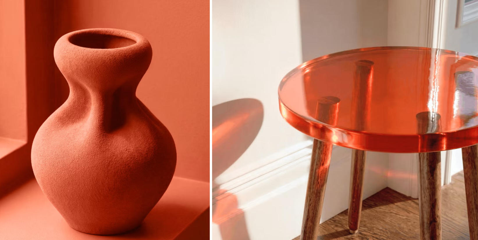 同一种橙色,放在陶土、绒布、原木、金属上,气质也完全不同。但关键原则不变,挑选材质时,优先选择天然材质:原木、藤编、棉麻,和大地橙的气质最搭。