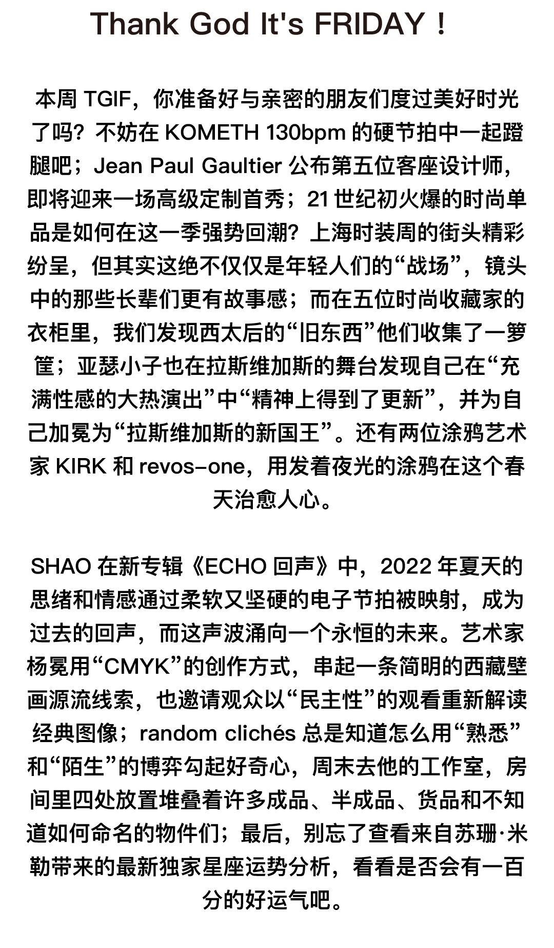 VOGUE官方小程序全新上线 点击查看往期TGIF 点击阅读更多VOGUE+精彩内容 编辑Mago Tang 编辑助理 Rilke、Annette、Jo、Roey 视觉设计乐乐、小乙